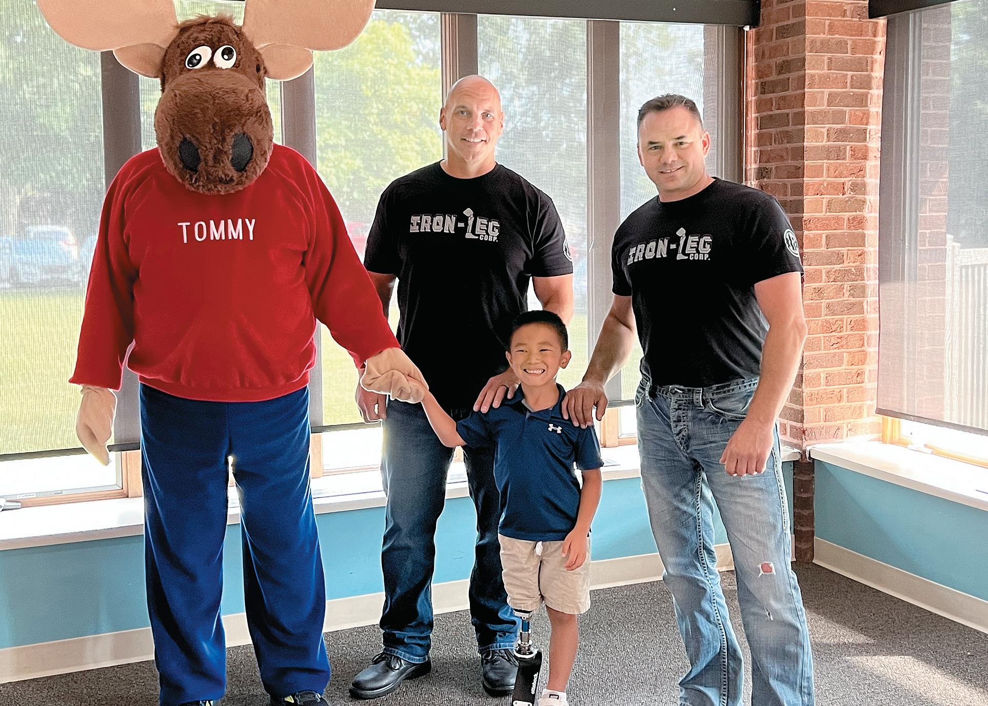 Moose International’s Tommy Moose (back, left), along with Iron-Leg president Matthew Millhouse (back, center) and vice president Sean Laukhuff, encourage community members to support a golf outing that will raise funds for prosthetics for children like Joseph (front).