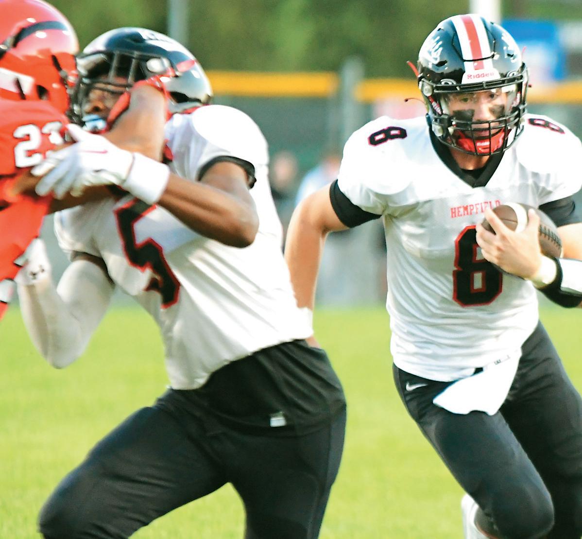 Hempfield quarterback Jackson Landis (8) runs behind the block by Micah Gates during the Black Knights’ 41-20 victory in a Section One contest at McCaskey on September 15.