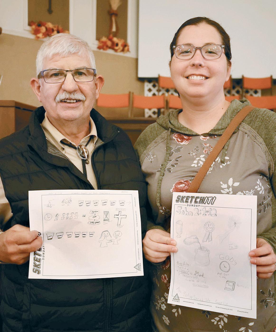 Jerry Miller and his daughter-in-law Abby display their notes after a Sketch It! Sunday service.