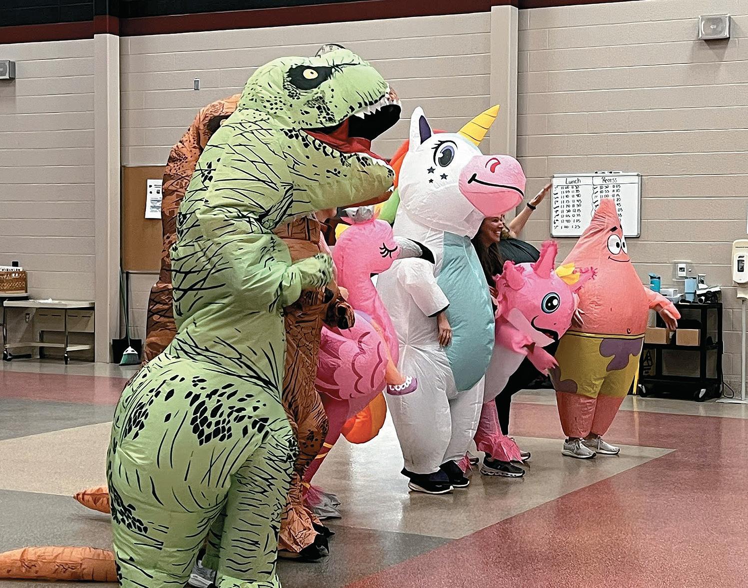 Teachers wear inflatable costumes during the special school assembly to celebrate the school’s fundraising results.