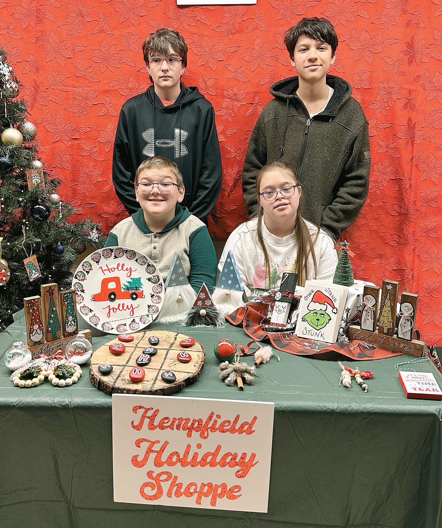 Displaying some of the items that will be available to purchase at the upcoming Hempfield Holiday Shoppe are (front, from left) Aidan D., Connery P., (back) Zyler H., and Sean C.