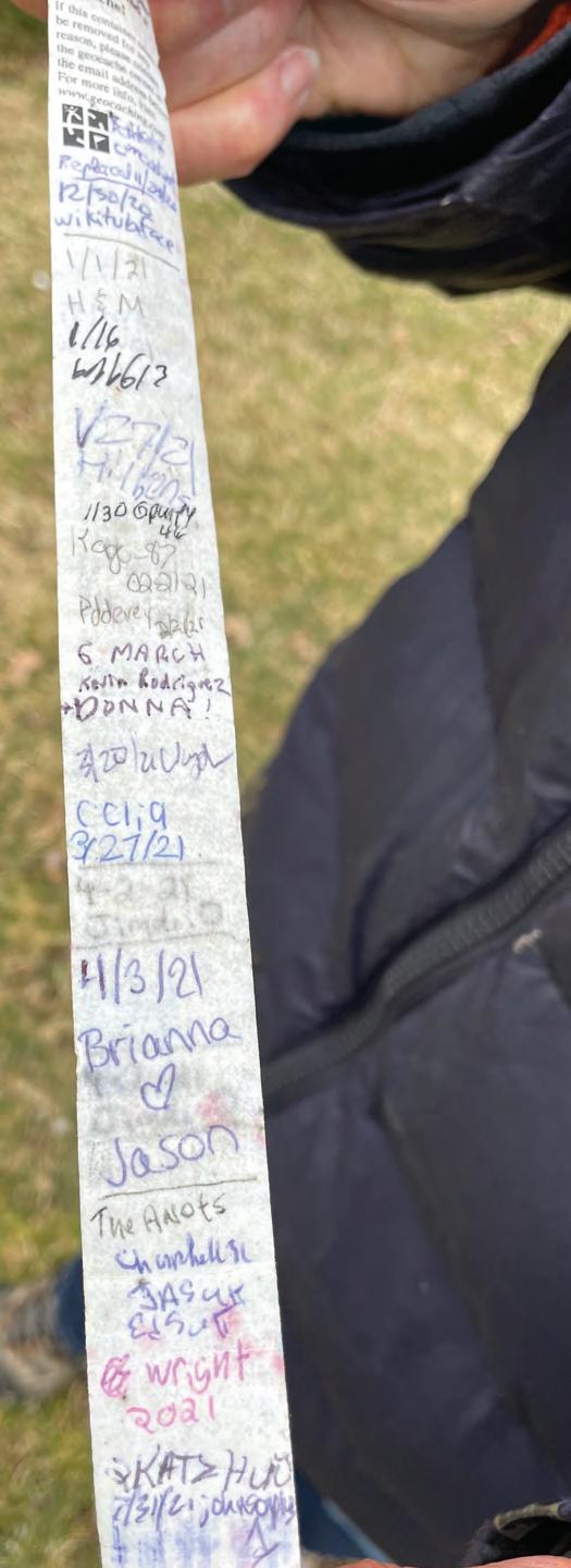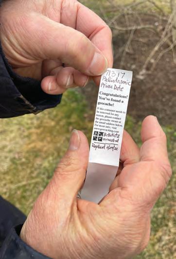 Geocaches, or “finds” in the lingo of regular participants, can offer a varied experience for participants. “Some require you to solve a puzzle before you can find them,” Katz said. Some include little objects such as coins or marbles to trade. The size of a cache can range from “nanos,” which could be as small as a half an inch long, to fivegallon drums. “The traditional geocache container is an ammo can,” Katz noted, “but you can really use any airtight, waterproof container.” Katz, who is currently the owner of about 250 active caches,