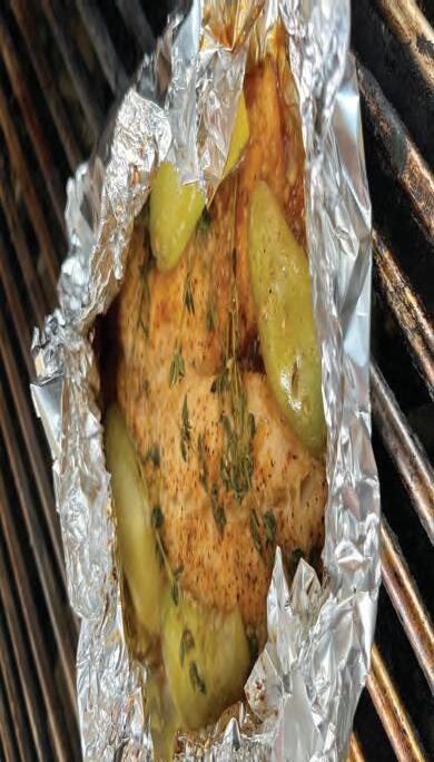 • Place one tablespoon of butter in the middle of two 12-by-12-inch inch foil sheets. Season both sides of tilapia filets with salt, pepper, and Old Bay and place directly on top of the butter. Top filets with three or four sprigs of thyme and drizzle with sauce. Loosely seal foil bags and place them directly on the grill.