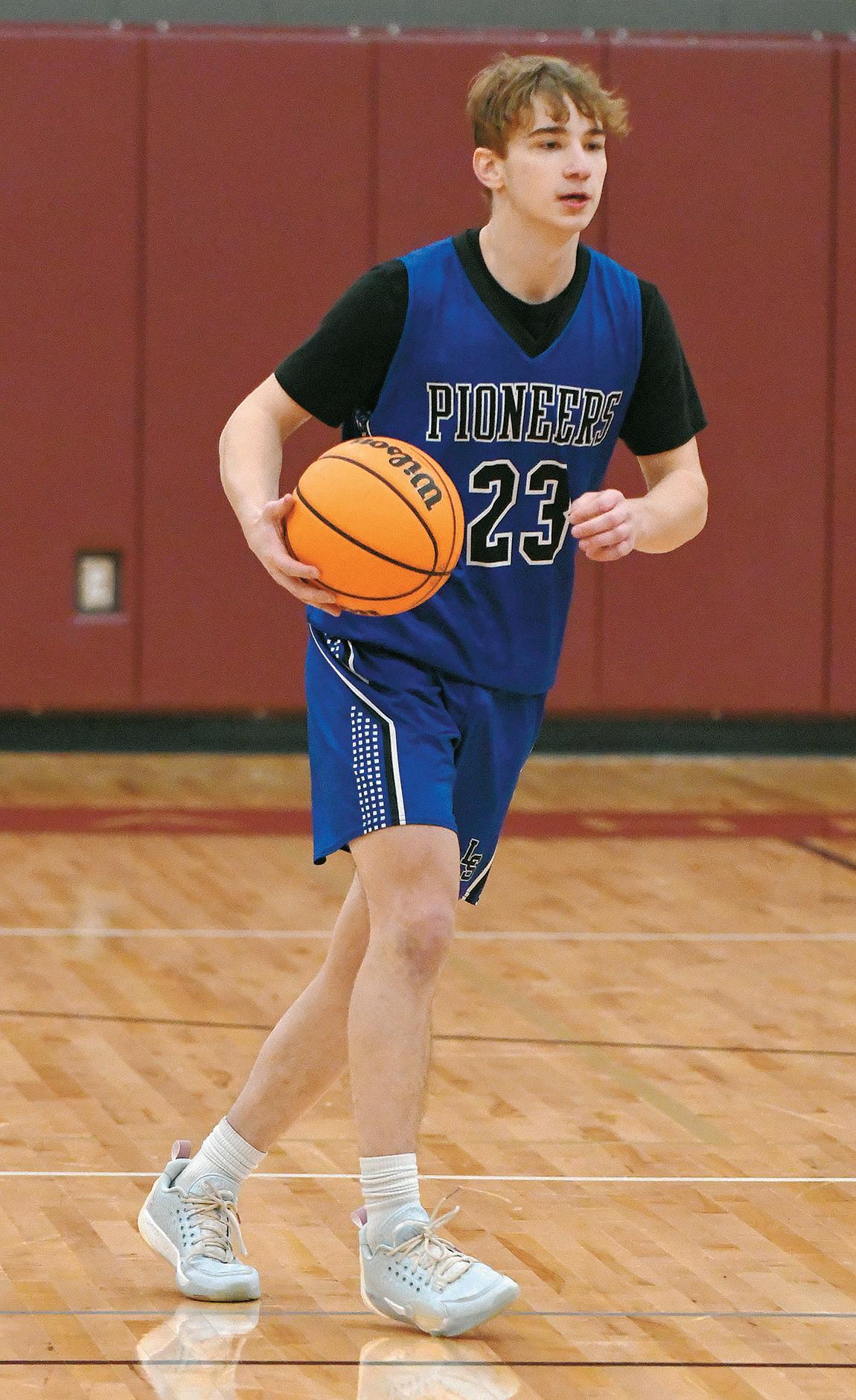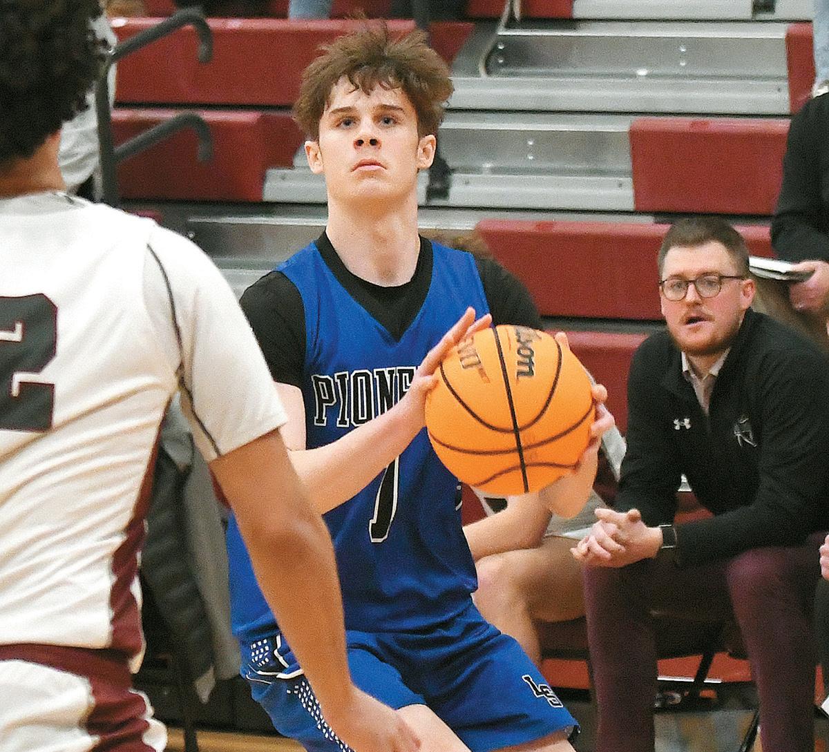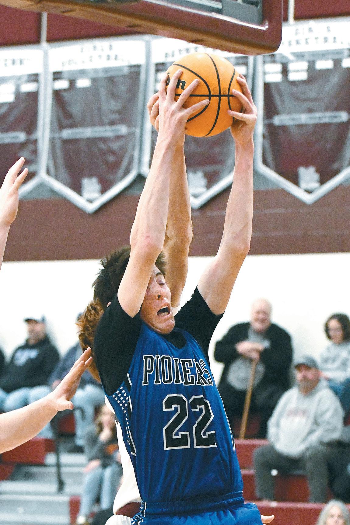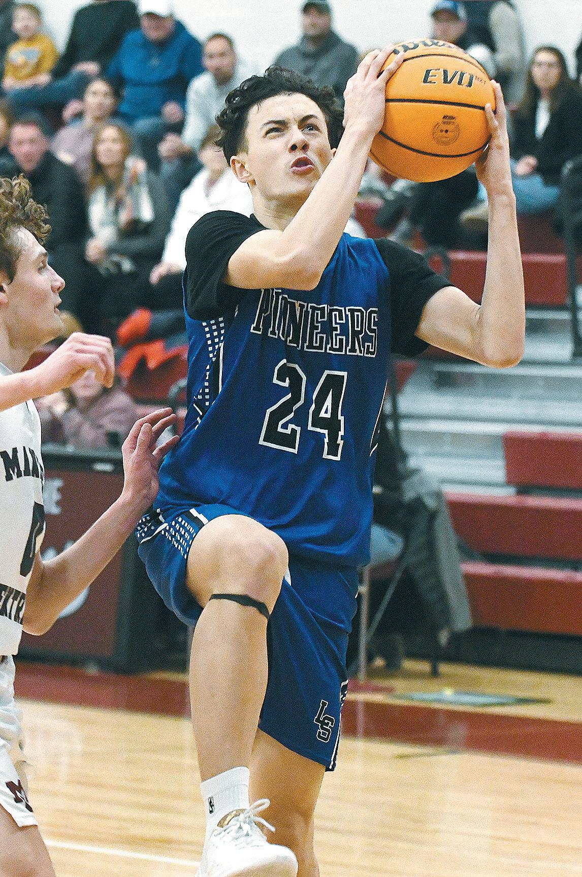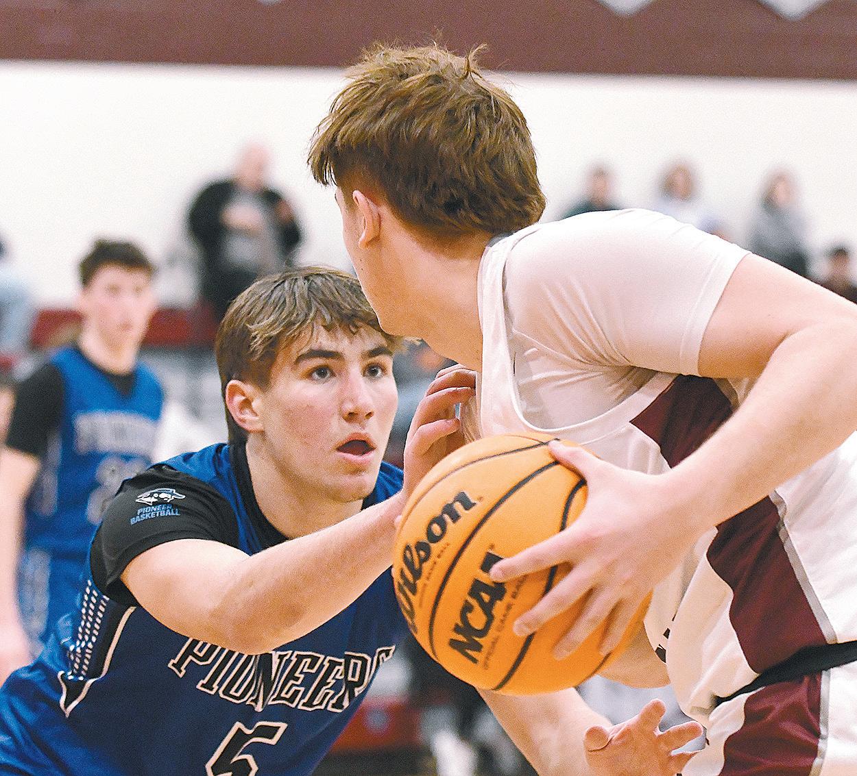 Pioneers’ Juan Galarza drives to the net against Manheim Central during a 64-61 victory on Thursday, January