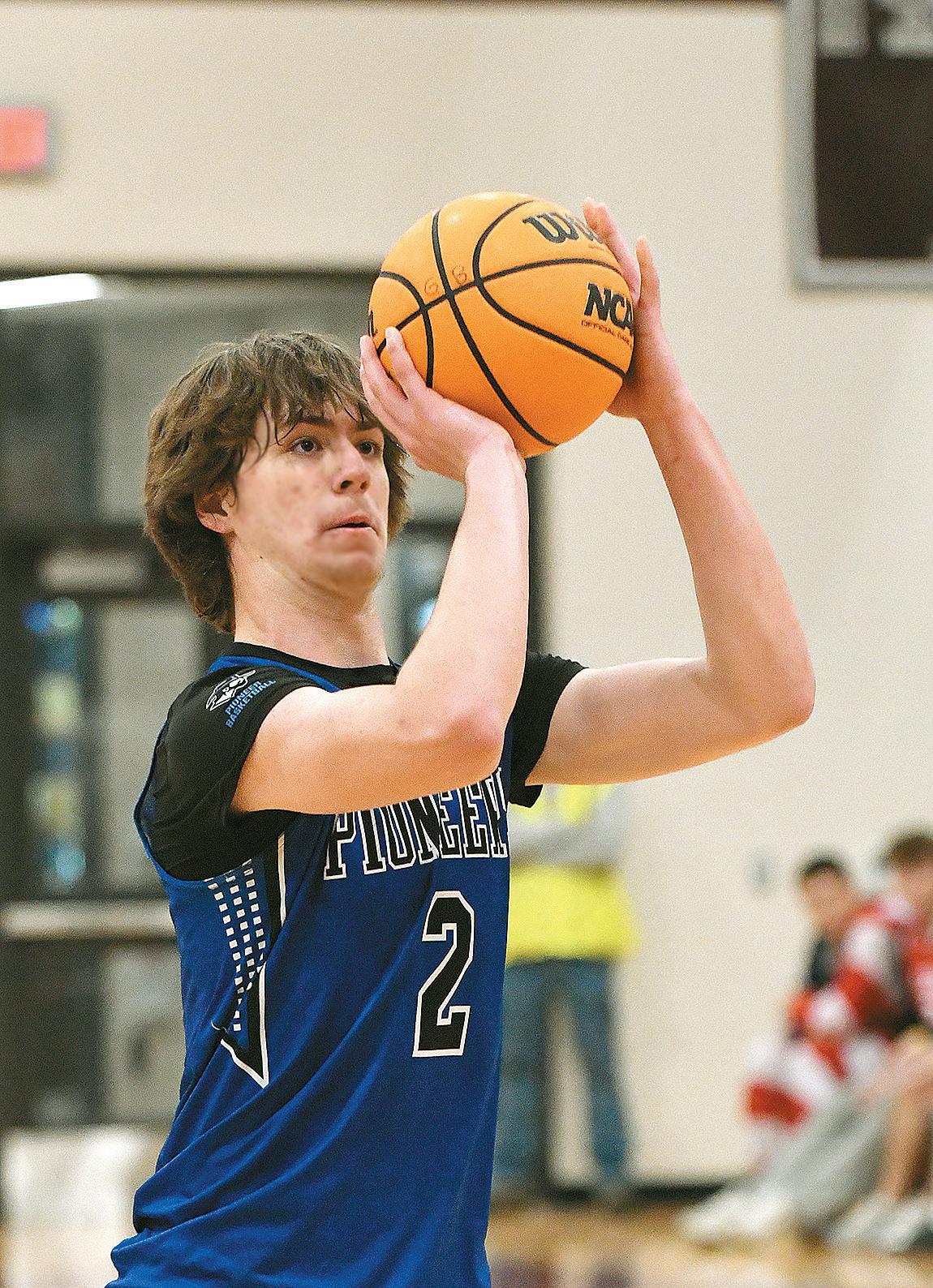 Hayden Martin of Lampeter-Strasburg sets up for the three-pointer against Manheim Central on Thursday, January 29, during a 64-61 win in Manheim. Martin led the team with 21 points.