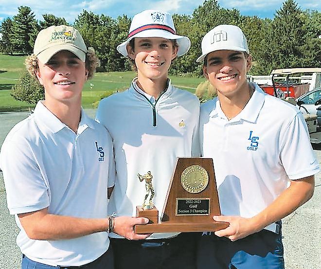 Pioneer senior golfers (lefto ro right) Morgan Smith, Ben Wilson and Jason Long stand with the Section Three trophy they received at the L-L League golf championships at Fairview Golf Course Monday, Sept. 26.