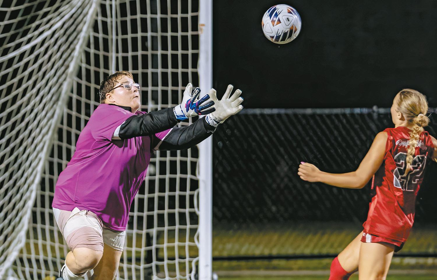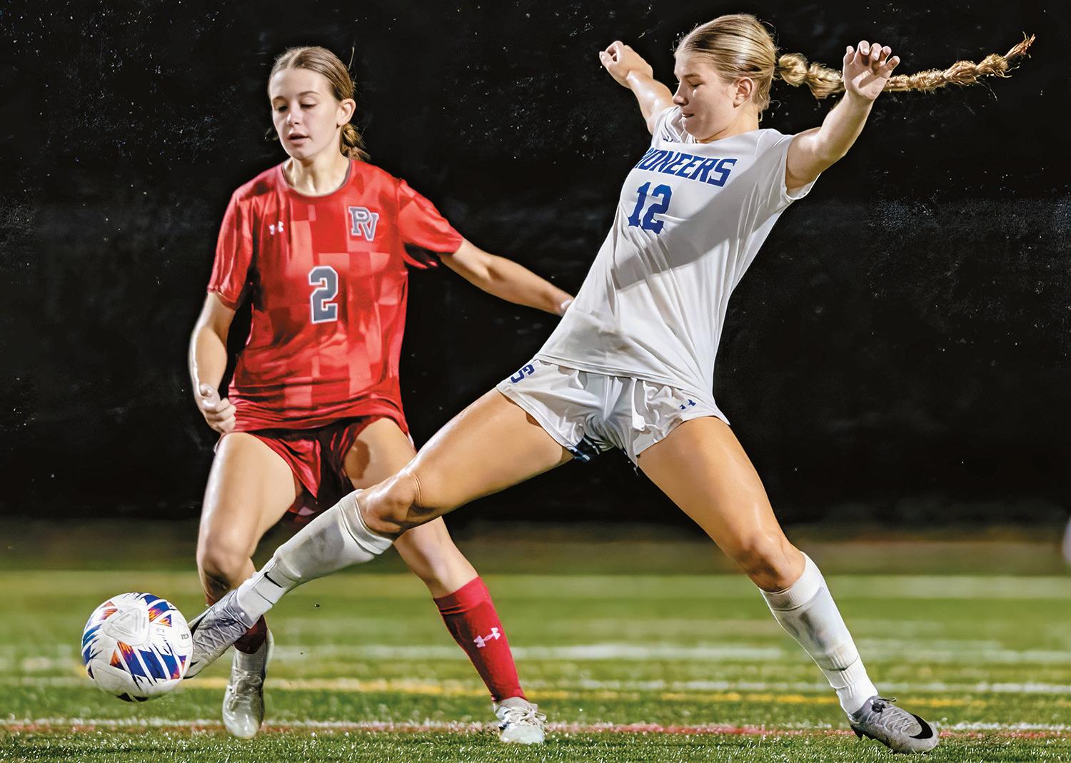 Under the lights, Lampeter-Strasburg’s Kali O’Connell stretches for the ball against Pequea Valley’s Alexa Petro during a 4-2 triumph on Thursday, September 25. O’Connell sparked the offense with a hat trick.