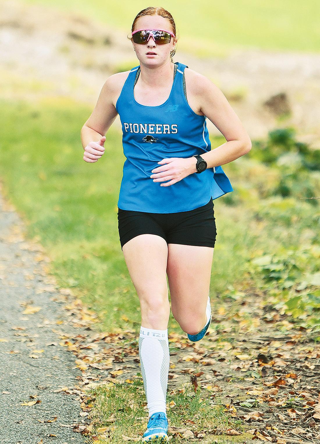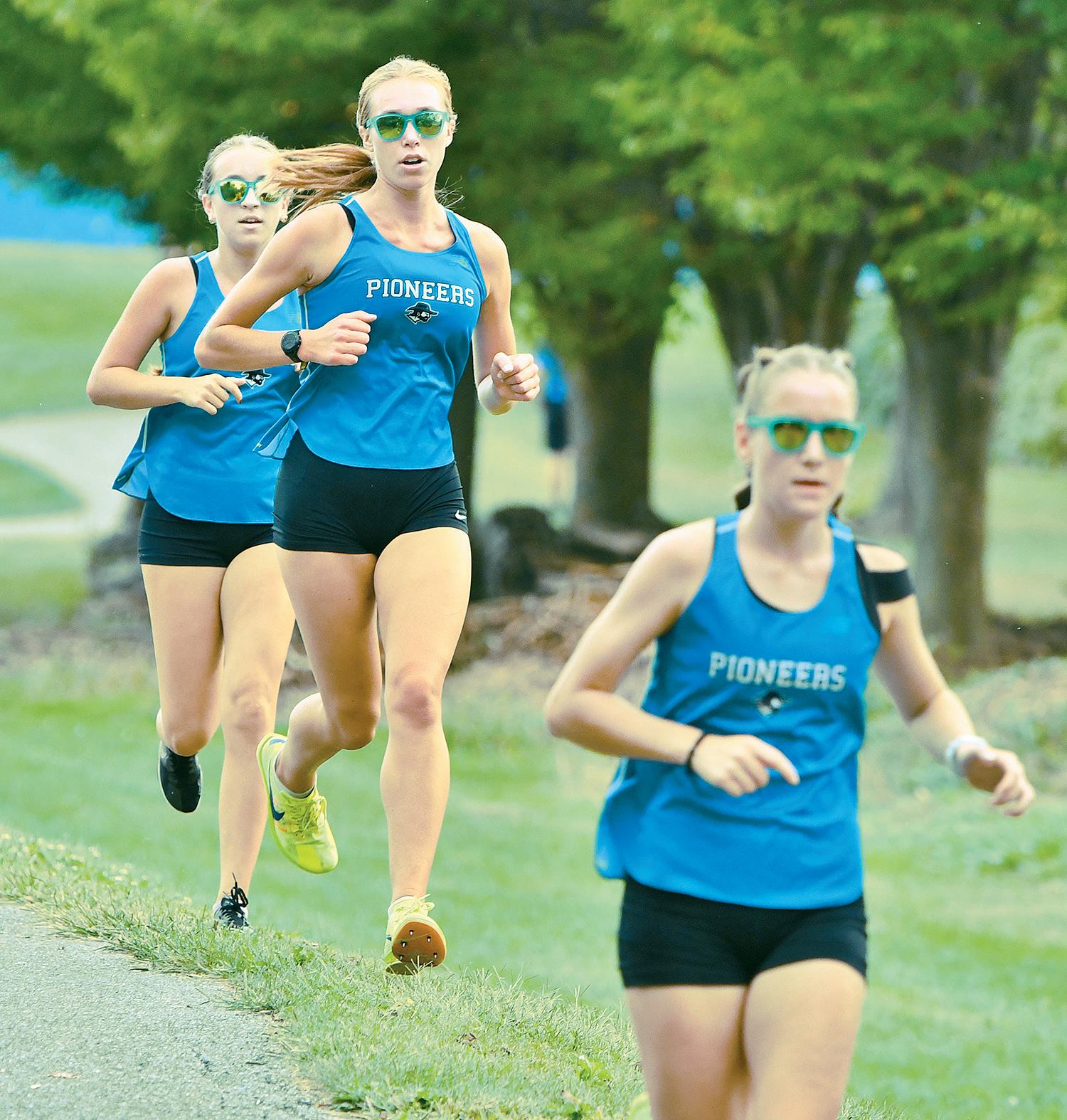 (front to back): Evelyn Kennel, Lilah Schwartz and Maddy Albright work their way through the final third of Lampeter-Strasburg’s home course Tuesday, September 30. The Pioneers defeated Cocalico and Manheim Central to cap a Section Two leading undefeated season and the section crown.