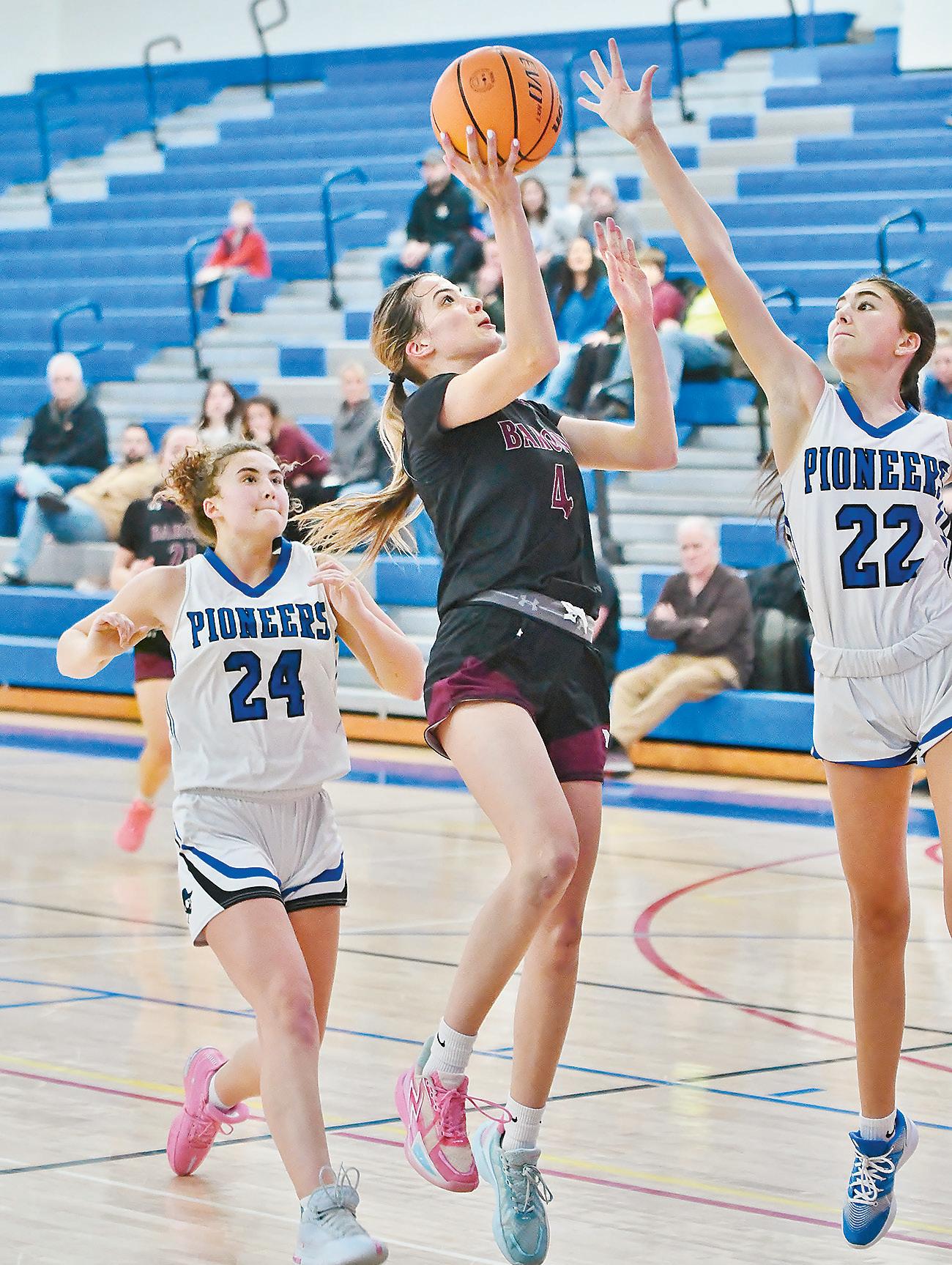On Monday, February 23, Baron’s Madelyn Gehman drives the lane as Pioneer’s Trinity Carter defends in a 38-36 loss during the PIAA District III Class 5A consolation semifinals round in Lampeter.