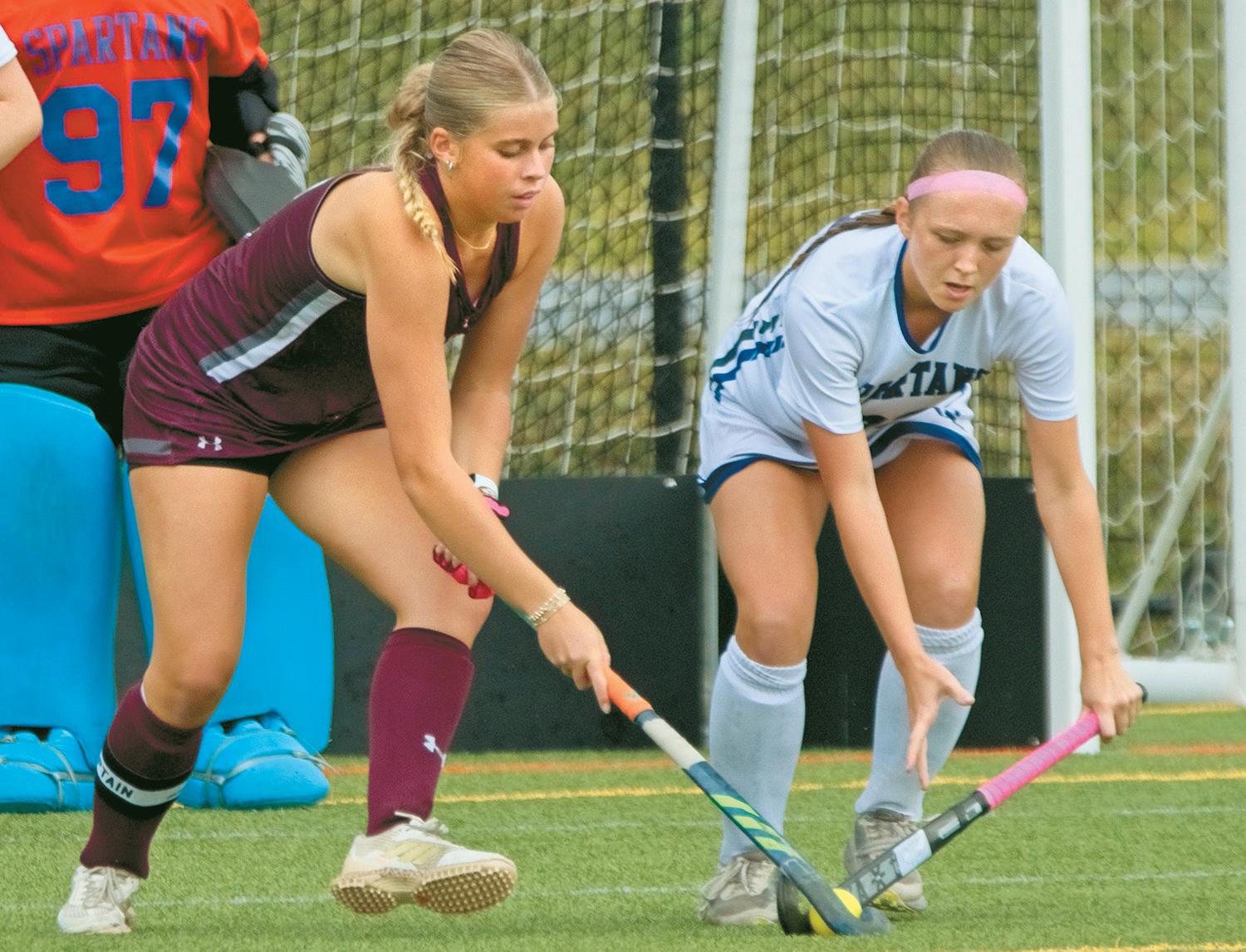 Manheim Central’s Alexxandra Rada works to get around Garden Spot’s Elena Martin during a 2-0 victory on Tuesday, September 23, at home. Rada had an assist.