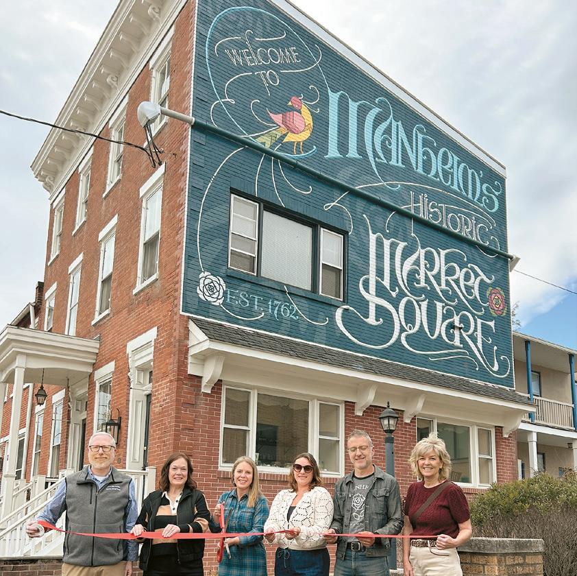 The mural features the phrase “Welcome to Manheim’s Historic Market Square” in calligraphy designed by Hannah.