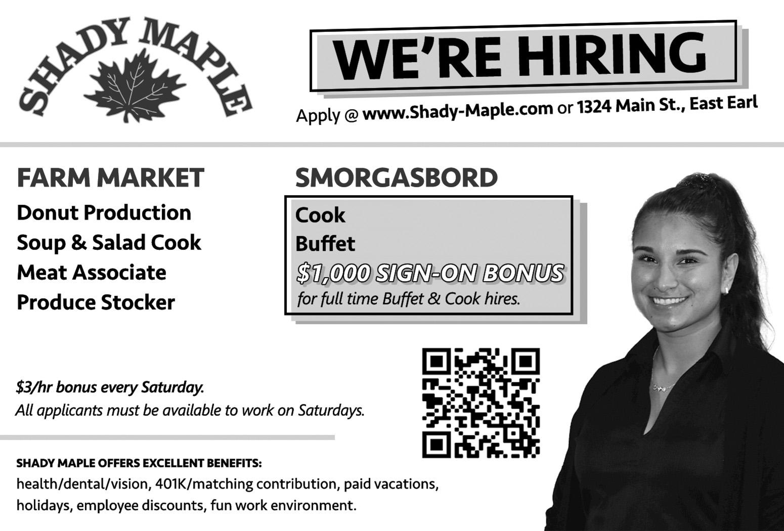 2- COMMUNITYCOURIER - Morgantown/Honey Brook Edition - January 4, 2023 townlively.com For more info, please contact Pam Santiago via email at officemanager@restartministry.org or phone at 717-304-3291 or visit www.restartministry.org. THIS EVENT HAS LIMITED SEATING! RESERVE YOUR SEATS EARLY. TICKETS WILL GO ON SALE TO THE GENERAL PUBLIC ON DECEMBER 15 TH, 2022. ALL SALES FINAL. estart Training Center Ministry, Inc. “Loving People To Spiritual Renewal” Proceeds Benefit: During the banquet a free-will offering will be taken to help with the mission of Restart Training Center Ministries, Inc. Table Sponsorships for Banquet Costs Early Registration: $375 per table of 8 if submitted by January 14, 2023 Registration: $425 per table of 8 if submitted after January 14, 2023 Individual & Couples Tickets Early Registration: $50 per ticket, $95 per couple if submitted by January 14, 2023 Registration: $55 per ticket, $105 per couple if submitted after January 14, 2023 2023 8th Annual RTCM Valentine Sweetheart Banquet Special Guest Speaker EVANGELIST NELSON COBLENTZ visit: www.gospelexpress.com January 31, 2023 Doors Open @ 5:30pm (special music by Nelson & Sarah Coblentz) Fellowship Meal @ 6:30pm (Catered by Shady Maple. Includes door prizes.) Faith Mennonite High School 5085 Woodland Drive • Kinzers, PA 17525 Special Guests: Nelson & Sarah In 1984, Nelson & Sarah Coblentz felt God’s call on their lives to proclaim the gospel to the world through preaching and singing, which led them to found the ministry Gospel Express Evangelistic Team based in Columbus, NC . SPONSORED IN PART BY: R091016 Dr. Lois Wida & Dr. Robert Garfield American Optometric Association Members at: Adamstown Eye Care Eye Health Care, Exams, Glasses and Contacts Call 717-484-0934 Across from Weaver Markets at Routes 272 & 897 Mon. thru Fri., Varied Eves and Sats adamstowneyecare.com New Patients Welcome! R091616 R091125 MEDICAL & HANDICAP SUPPLY Parts - Service - Shipping - Rental - Repair FLA Orthopedic Products. Activa Compression Legware In Stock • Power Wheelchairs & Scooters • Lift Chair • Hospital Beds • Medical Supplies • First Aid Kits • Tranquility Diapers - Guaranteed Better! • Batteries For Medical Equipment • Patient Lift • Stair Lift • Catheters • Independent Living Aids • Walkers • Bath Chairs • Remote Shower Heads SUNSET MOBILITY, LLC 3119 Lincoln Hwy. E., Paradise, PA 17562 Located at the corner of Rt. 30 & Old Lecock Rd. Open: Mon.-Fri. 8 AM-5 PM, Sat. By Appointment Phone 717-687-0155 John Beiler ROUTE 10 ROADSIDE MARKET WINTER HOURS: Mon.-Thurs. 7am-5pm; Fri. 7am-6pm; Sat. 7am-4pm R091464 A full line grocery with meat, cheese, bulk items & baked goods 941 Compass Road, Honey Brook, PA 19344 Putt’s California Tree Ripened Navel Oranges (Regular & Organic) Chemical-Free Lemons; Grapefruit; Clementines, Variety of Apples. STOP BY TO SEE THE WIDE VARIETY OF FRUIT. Organic Carrots R091466 Monday-Thursday 8-5; Friday 8-8; Saturday 8-2; Sunday Closed 1620 Cambridge Rd., Honey Brook, PA (610) 273-2990 SHOE REPAIR ALSO AVAILABLE We’ll fix your boots & shoes, purses & leather goods with quality materials! Boot Up for Winter Shop low prices on all of the latest styles for men, women & kids. VISIT OUR WEBSITE AT www.townlively.com R087418 Published By Engle Printing & Publishing Co., Inc. PUBLISHED WEDNESDAYS The Community Courier reserves the right to reject any advertisement. The Community Courier assumes no financial responsibility for any typographical errors in advertisements but will reprint that portion of an ad in which error occurs. Advertisers submitting artwork and images for use in advertisements assume all liability in regards to trademark and copyright infringements. We encourage civic and fraternal groups, schools, churches, scouts, and other local organizations to submit news releases of general interest to the majority of our readership. Primary consideration is given to dated articles of an informative nature–activities and events of local interest sponsored, presented, or planned by area organizations and institutions. Related photographs of good quality are encouraged also, but complete picture identification must be included. Undated articles of general interest are used as space permits. All articles must contain a contact name and telephone number. Submit Camera Ready Ads at: engleonline.com sales@engleonline.com Submit Classified Ads at: townlively.com 1-800-428-4211 classifieds@engleonline.com Display Advertising Deadline 3 P.M. Wednesday Display Ad Customer Service 717-492-2530 Fax 717-492-2580 News Deadline Noon Tuesday News Department 1-800-800-1833 Extension 6018 Classified Advertising Deadlines By phone 2 P.M. Wednesday Online Noon Wednesday (Except Early Holiday Deadlines) Circulation / Distribution Customer Service 1-800-800-1833 Extension 6014 Mailed outside our circulation area for $36.00 a year. Send news requests to: Community Courier Editor Engle Printing & Publishing Co., Inc. P.O. Box 500 Mount Joy, PA 17552 or submit by email to news@engleonline.com circulation@engleonline.com MORGANTOWN - HONEY BROOK Community Calendar