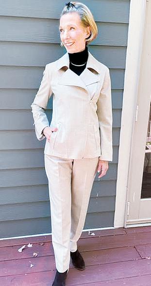 For this year’s look, Martin sewed a three-piece ensemble, which consists of her version of a lightweight motorcycle jacket that she created using a McCall’s pattern. It features a diagonal zipper, pleather tab-and-stud details and a silk lining. She also made matching lined slacks and a black turtleneck sweater using a digital pattern. Martin wore black accessories, but she plans to wear the outfit with jewel tones in the spring.