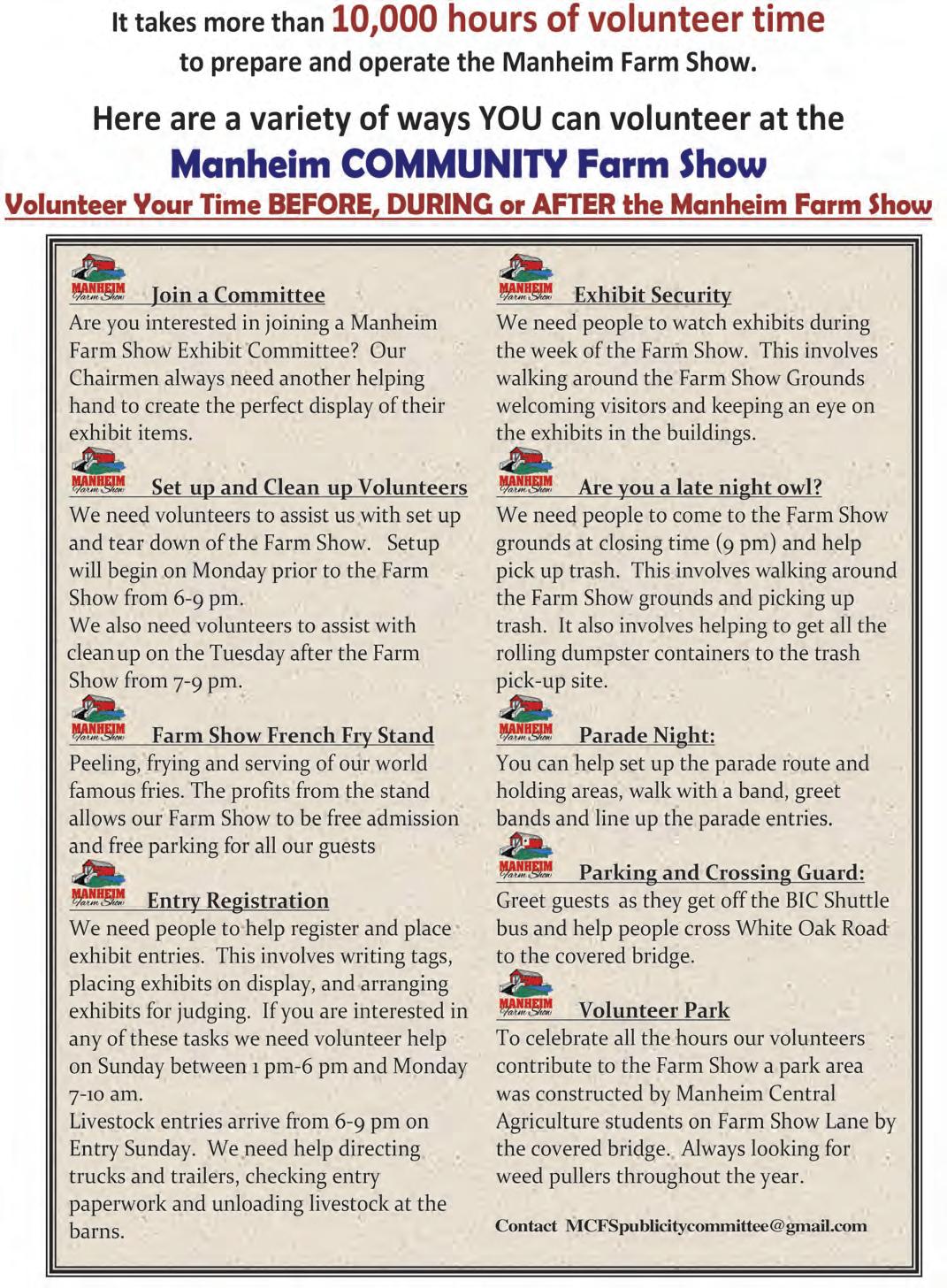 The Manheim FFA members would like to thank everyone who donates materials for the Children's Farm Show display and to all who contribute at the Gospel Sing.