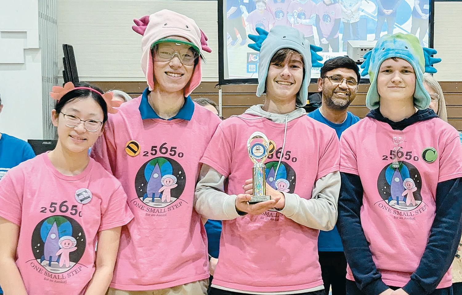 On Jan. 12, One Small Step for an Axolotl, which is made up of four Manheim Township School District students - juniors Isaac Link, Grant Lowther and William Lee and seventh-grader Elizabeth Lee - took top honors at a 30-team robotics event hosted at Manheim Township High School, the Blue Streaks Qualifier Tournament. The team, which bested entries from all over Pennsylvania, designed, built and programmed its own robot; responded to questions from judges about its design; and worked cooperatively with other robotics teams.