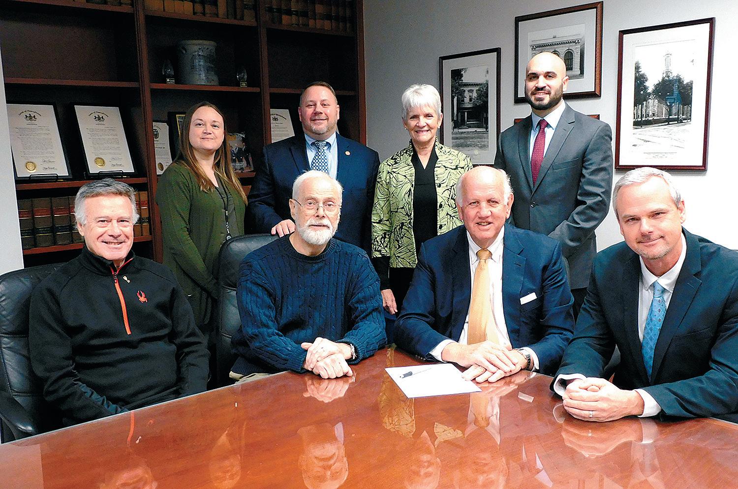 In attendance at the closing of Chester County’s historic Crebilly Farm were (seated, from left) Westtown Township Board of Supervisors member Dick Pomerantz and chairman Tom Foster; David Robinson, owner and steward of Crebilly Farm; Ed Yost, vice chair of the Westtown Township Board of Supervisors; (standing) Liudmila Carter, Westtown Township manager; Patrick McKenna, Westtown Township solicitor from Gawthrop Greenwood; state Sen. Carolyn Comitta; and Gordon Prince, Gawthrop Greenwood business law attorney.