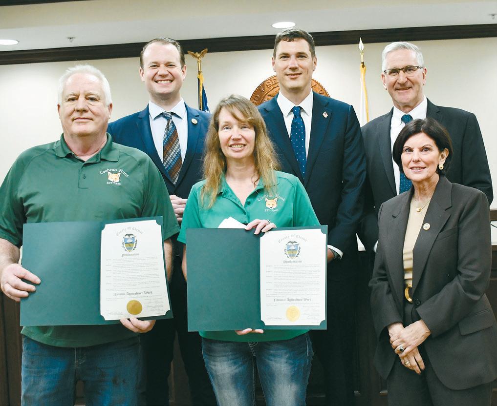 Following the recognition of Pennsylvania 4-H Week, the commissioners proclaimed National Agriculture Week, highlighting the economic, cultural, and environmental importance of agriculture in Chester County. Agriculture remains one of Pennsylvania’s leading industries, and Chester County is among the state’s top agricultural producers. As part of the proclamation, the commissioners also recognized Bob and Adrienne Cochran of Hidden View Farm as owners of the only known Chester County tricentennial farm, honoring families whose farms have remained in continuous