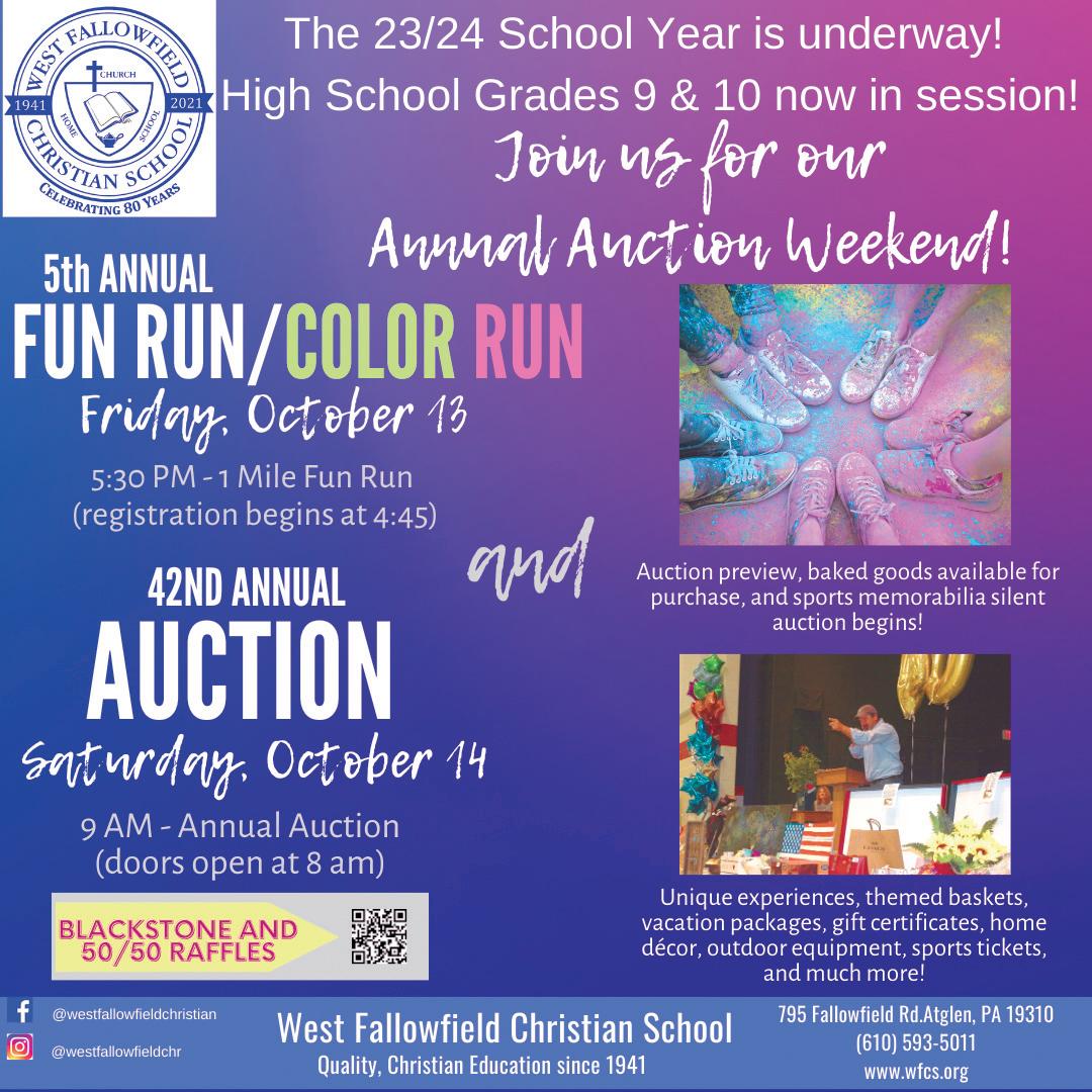 Aweekend of activities has been planned at West Fallowfield Christian School (WFCS) on Friday and Saturday, Oct. 13 and 14. Events will include the fifth annual fun run and the 42nd annual auction. Community members are welcome to participate.