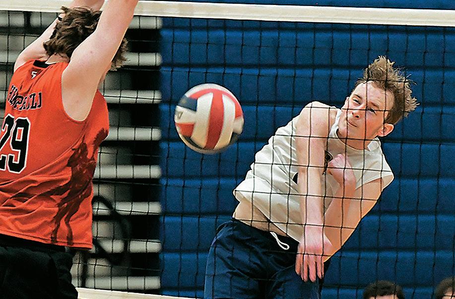 Penn Manor’s Will Brady gets the kill by Hempfield’s Cameron Crawford in a 3-1 loss on Thursday, April 2, at home.
