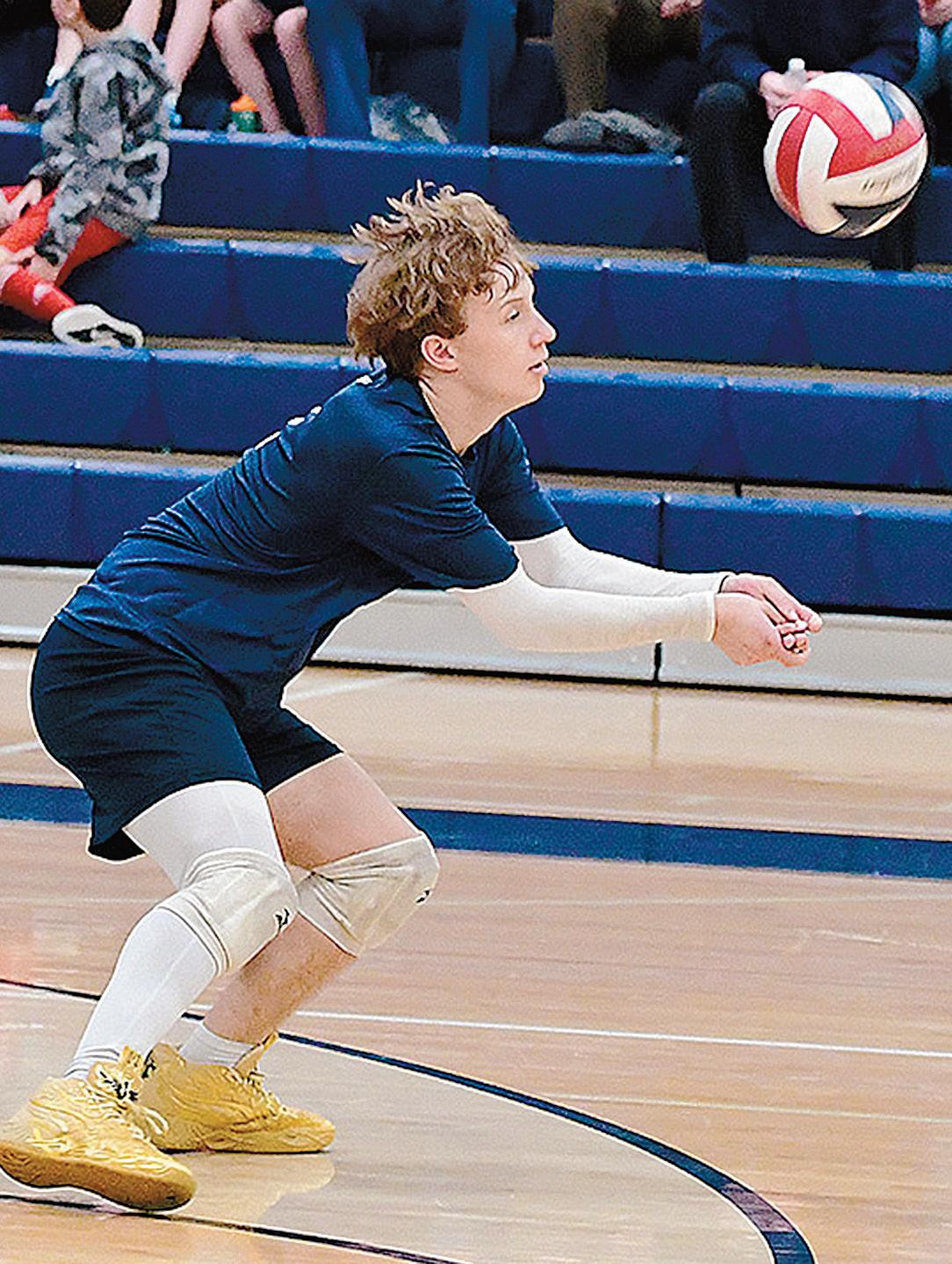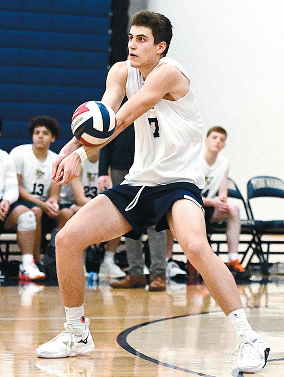 Comets’ David Kirkley bump passes to a teammate against Hempfield in a 3-1 loss on Thursday, April 2.