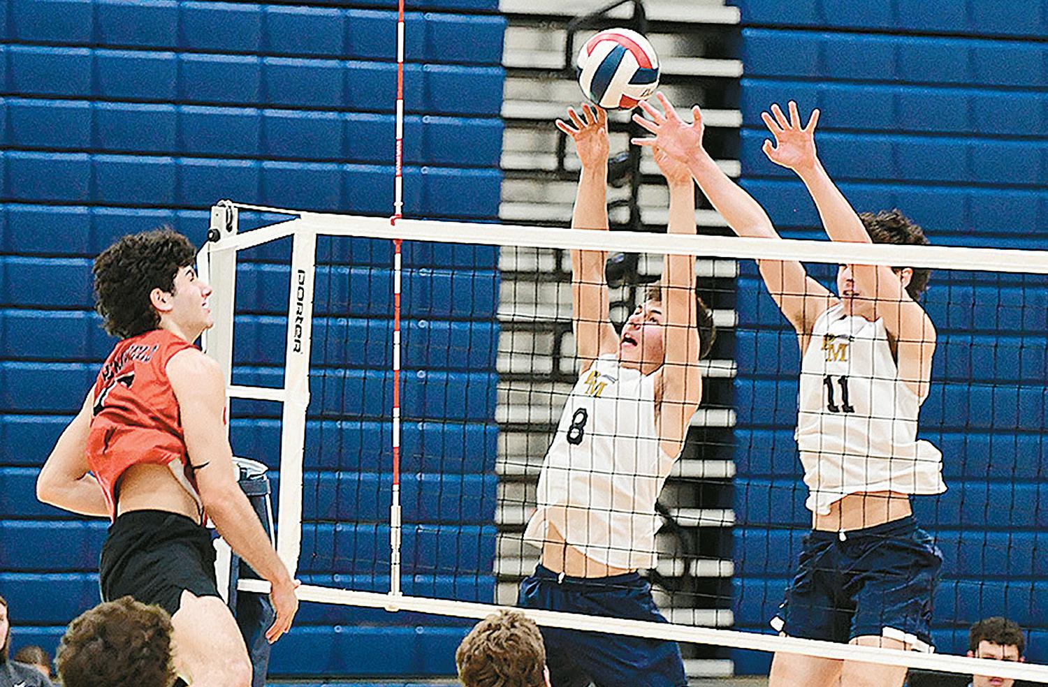 During league play on Thursday, April 2, Comets’ Landon Hess (8) and Kadin Rupp (11) go up for the block against Hempfield’s George Agadis in a 3-1 loss on Thursday, April 2.