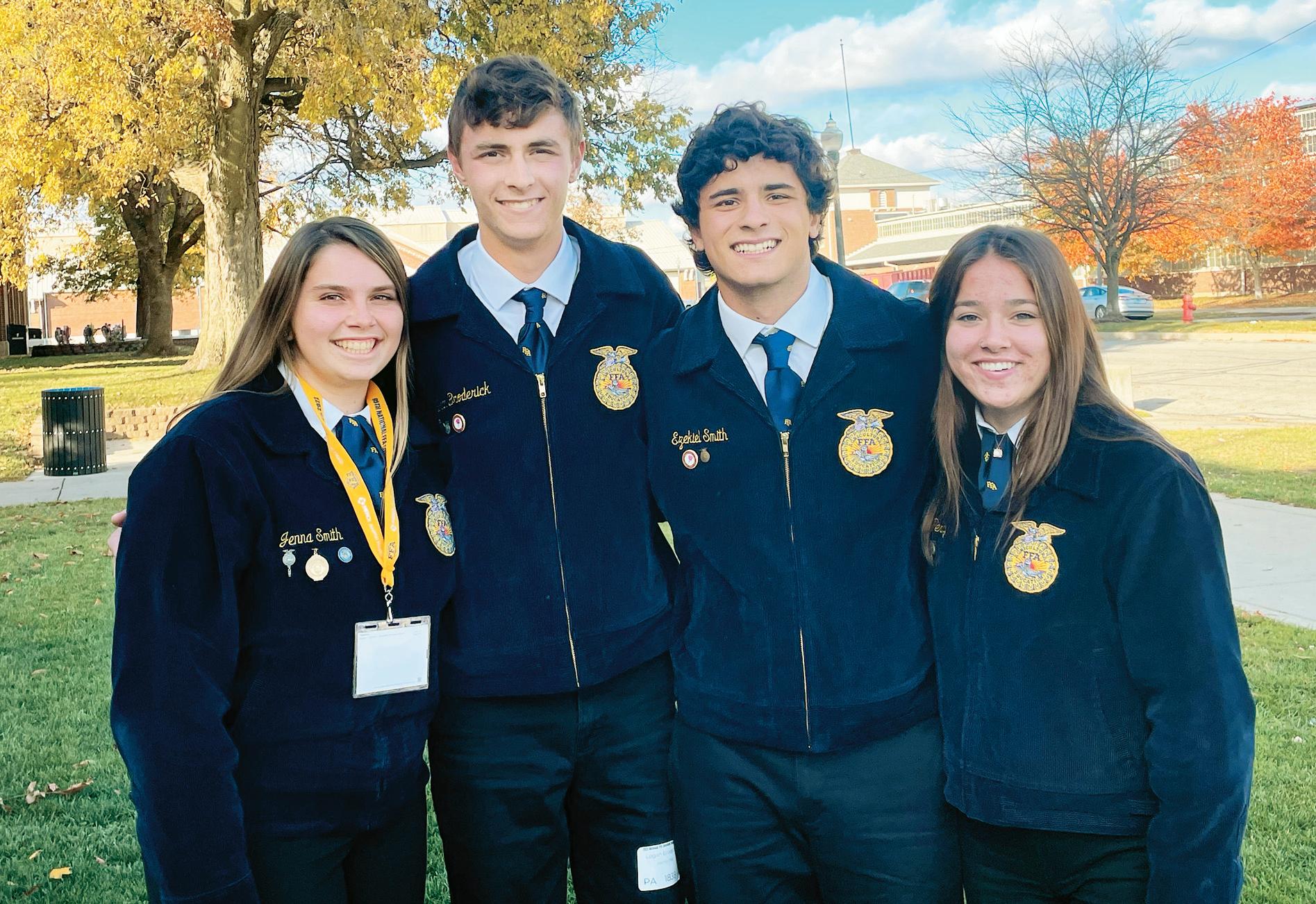 The FFA livestock evaluation team, comprising students Logan Broderick, Chloe Perry, Ezekiel Smith and Jenna Smith, earned a silver ranking and placed 30th among 45 teams. The livestock evaluation team assessed nine animal classes, took individual general knowledge tests, completed an activity on animal genetics and gave oral presentations to explain its placement of each class of animals. Broderick and Perry earned silver medals individually, and Jenna and Ezekiel each earned a bronze medal.