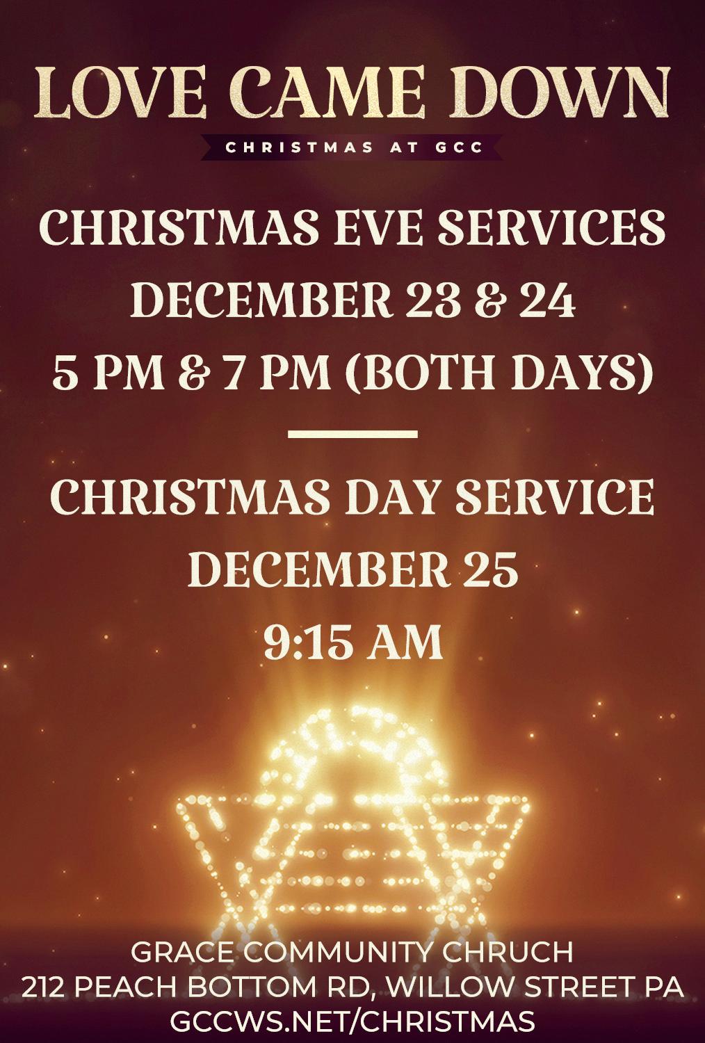 3:00, 6:00 Traditional Service of Holy & 9:00 pm Communion with Candle Lighting and Carols Christmas Day: