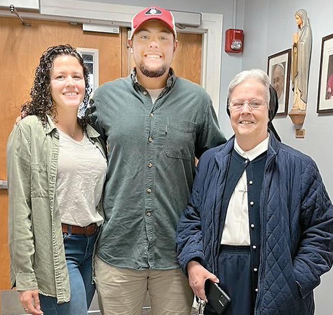 Sacred Heart School’s Sister Eileen Barnett (right) helped Anthony Zangari (center) to plan his proposal to Mary Lobeck.