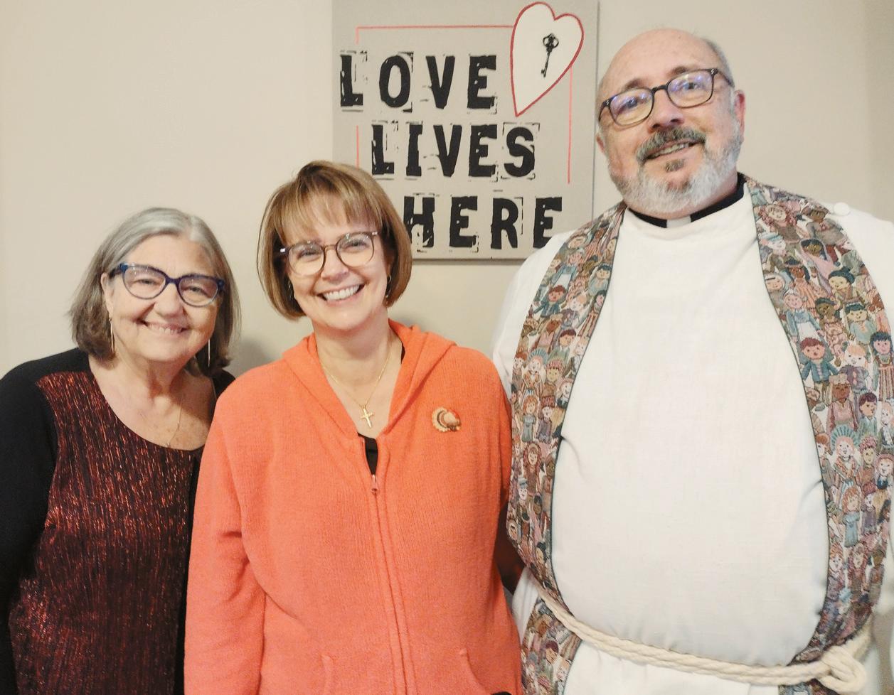 Associate pastor Deb Landis (left) greets Nicole Hummel (center) and the Rev. Joel B. Hummel.