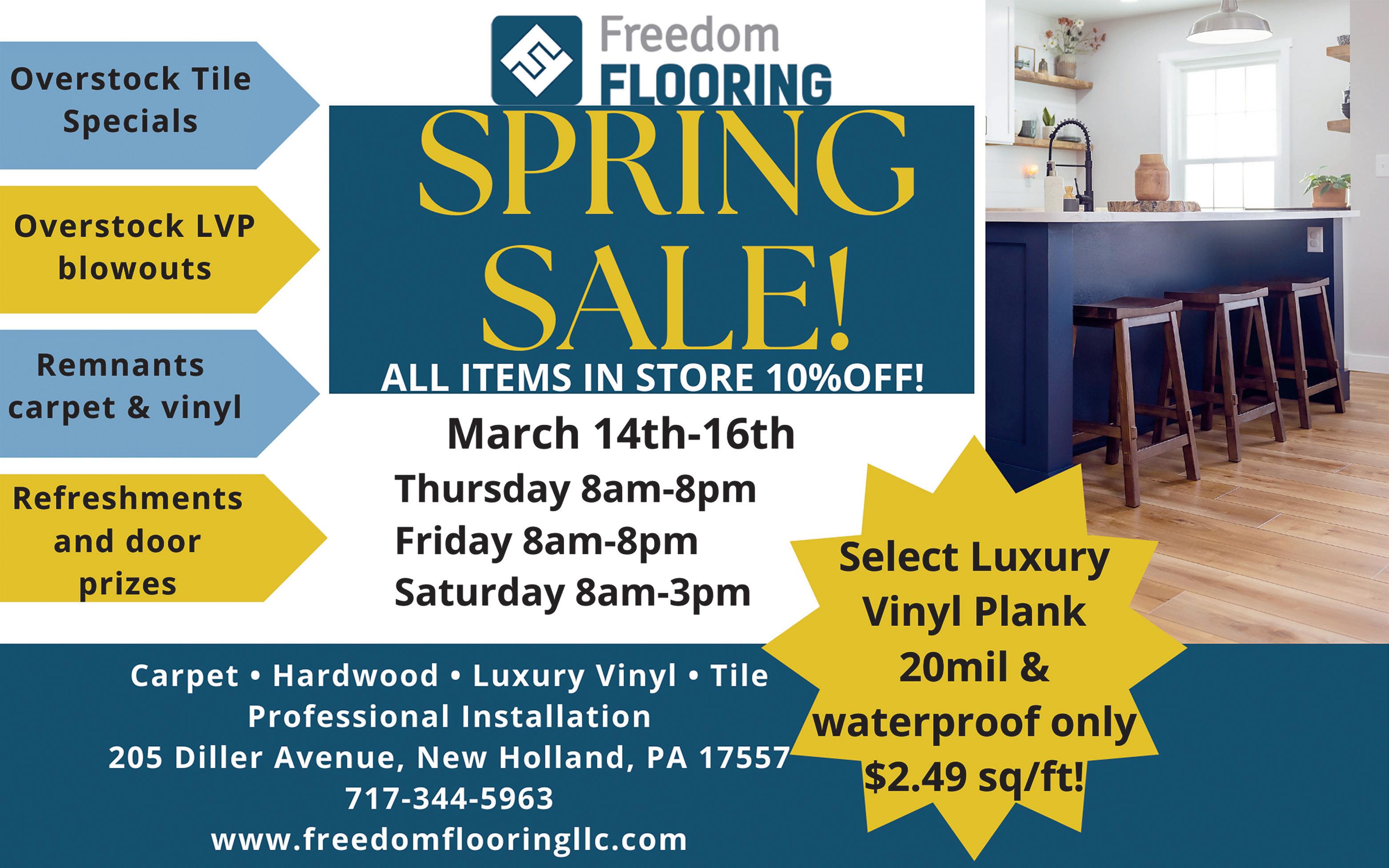 townlively.com Pennysaver - Pequea Valley Edition - March 6, 2024 - 3 10%-50% OFF Over 65 styles in stock! SHEET VINYL Regular Store Hours: M-W, F 8–4 • Th 8–7 • Sat 8-Noon 40 Glenbrook Rd, (Rt 772) Leola, PA 17540 #PA033474 (717)656-7077 spring flooring sale Sale Hours: Th 8am-7pm • F 8am-7pm • Sat 8am-1pm storewide March 21-23 Come and enjoy: • Our beautiful showroom for your inspiration • Over 500,000 sq. ft of IN-STOCK choices for your convenience • One-to-one guidance for optimal flooring to fit your family Spring is here! Up to 25% OFF Over 50 styles in stock! UP TO 20% OFF 10%-50% off Area Rugs, Carpet & Vinyl Remnants (100s to choose from) Food Truck Line Up Open to the public 3/21 • Lancaster Burger Company (11-1) • Gio’s Smokin’ Grill (4-6:30) 3/22 • Next Level Pizza (11-2) • Skip’s (4-6:30) 3/23 • What’s For Supper — serves breakfast too! (8-1) • Momma Moua’s Egg Rolls & Fried Rice (8-1) VINYL PLANK PORCELAIN TILE FREE Premium Pad with carpet (some restrictions may apply) CARPET FlorHaus.com R104703 Mon.-Thurs. 7-5, Fri. 7-7, Sat. 7-4, Closed Sun. John F. Martin Smoked White Turkey Breast $559 Lb. Kraft Mayo $299 30 Oz. Kraft Ranch Dressing $199 24 Oz. Hersheys 9 Oz. Chocolate Bars 2/$5 6 Pk. Dixie 7 Oz. Plastic Cups $439 200 Ct. R104614 Special Prices Good Thursday, March 7th thru Wednesday, March 20th or while supplies last 1403 W. Kings Hwy., Gap, PA 17527 (Blinking light at Rt. 10 & 340) 717-442-5768 DELI Check out our NEW Grab ‘n Go Section Sandwiches • Wraps • Cube Bologna • Cheese & More! R104239 LLC Large Variety of Succulents & Ferns Houseplants 32 S. Belmont Road Paradise, PA 17562 (½ mile South of Rt. 30) 717-687-8756 ISSPRING HERE! • Garden Seeds • Fertilizer • Potting Soil • Lettuce • Cabbage • Kohlrabi • Broccoli • Cauliflower