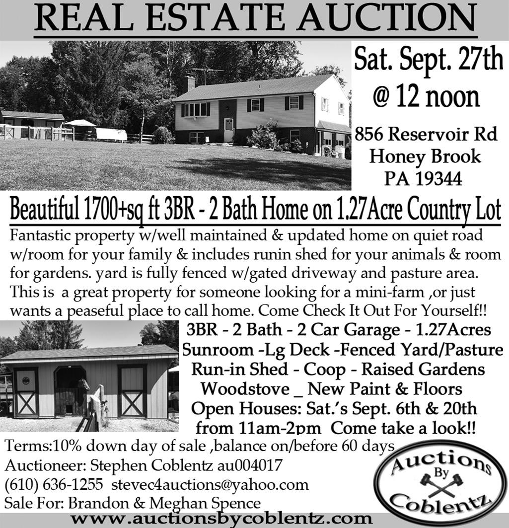 Colonial “one owner” dwl. w/3515 SF, eat-in kichen w/oak cainets, dining rm., living rm., family rm., 5 bdrms. (1st floor bdrm.), 2 baths, daylight bsmt. w/27x41 future rec/family rm., 2nd kitchen for canning or entertaining, utility rm., cold cellar, Blue Flame LP gas stove heat, large deck, brick patio, garage/ barn/shop bldg. w/2 car garage, (2) horse stalls, shop/tack rm., 2nd floor 32x55 finished & hay storage, bsmt. for garage & tools. 1.9 ACRES partially wooded, garden/lawn area, picnic area. After 10 years, owners moving to family farmette & serious to sell. Spacious country 5 bdrm. dwl. Ideal property w/large garage/barn/bldg. on rural acreage lot w/southern exposure. Minutes to New Holland, East Earl & Intercourse. Personal inspection by appointment or Open House Sat., Sept. 27, Oct. 4 & 11 from 1 to 4 P.M. For more information visit www. klinekreidergood.com. Financing, deposit or bridge loan available to qualified buyer. Call Randal V. Kline 717-733-1006 (Lender NMLS ID #834368)