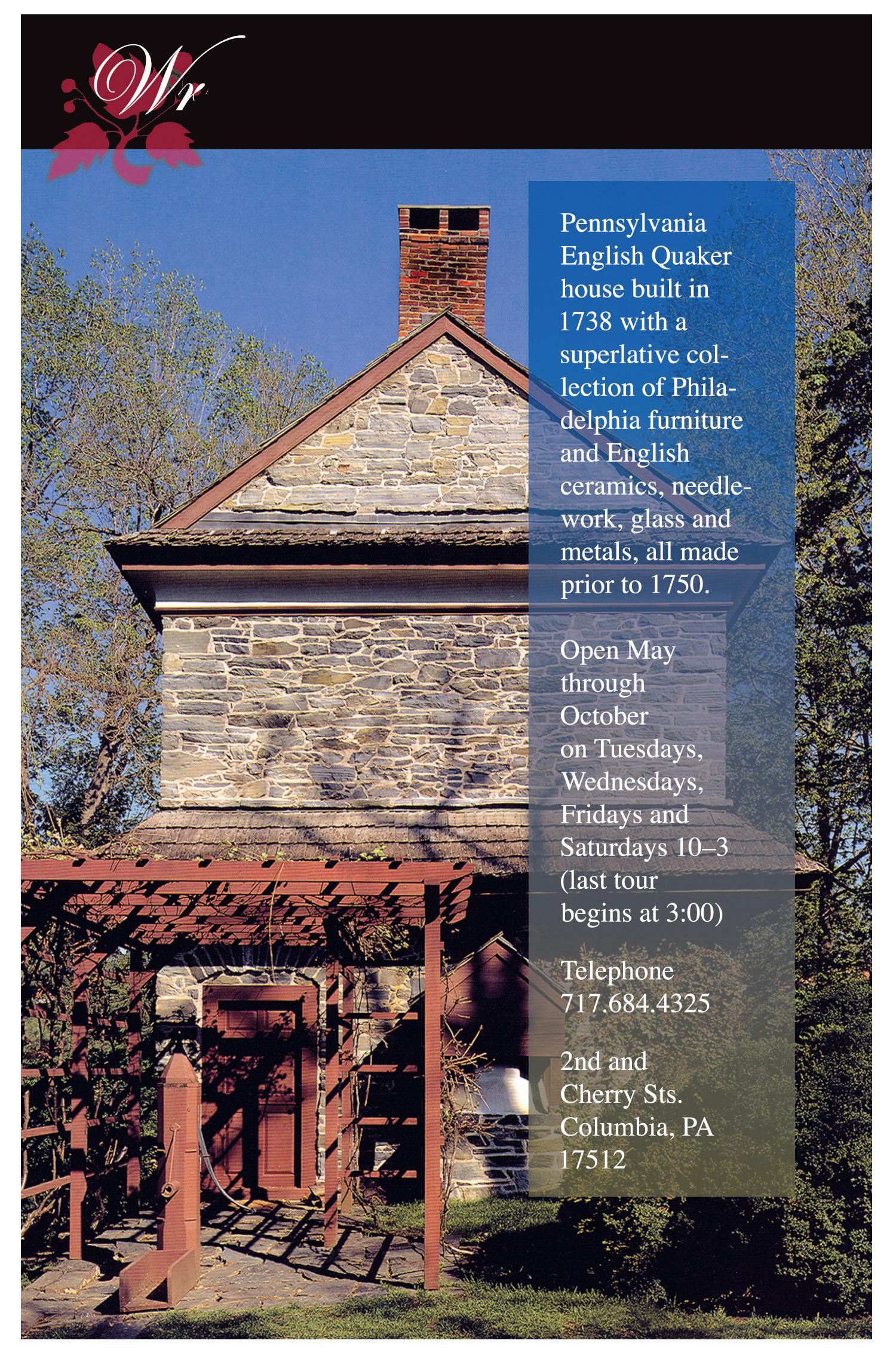 Built in 1738, Wright’s Ferry Mansion was the home of Susanna Wright, daughter of John Wright, founder of Columbia. The museum has been restored to reflect her tastes and interests with items made before 1750.