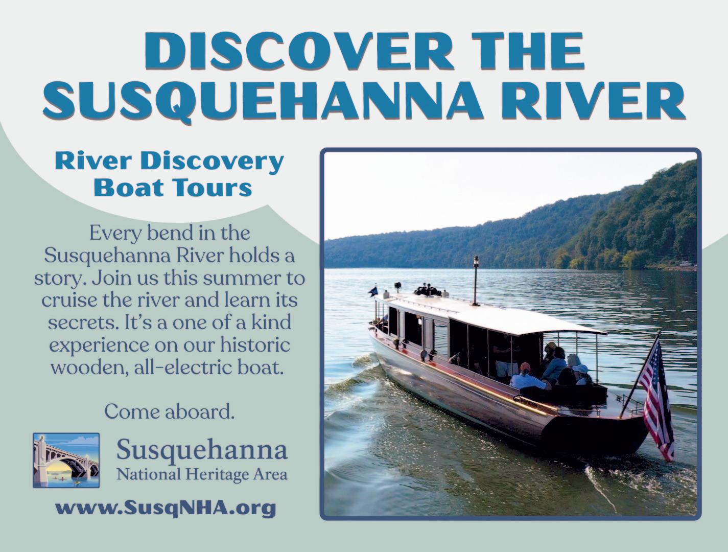 Let SNHA staff guide you on a one-hour tour of the river, sharing its natural beauty and cultural heritage. Experience the joy of being on the water, hear stories of the river, and view scenic landscapes and abundant wildlife aboard this elegant treasure from the past! Tours depart from the Zimmerman Center Memorial Day through mid-October. Advance reservations are recommended. 1706 Long Level Road • 717-252-0229 Susqnha.org/boat-tours