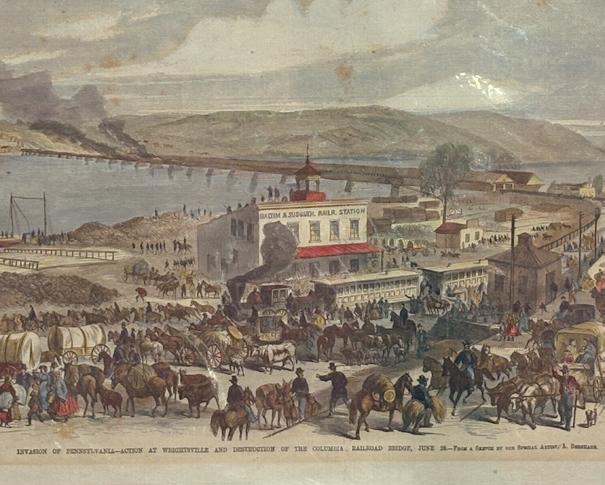 During the Civil War, invading Confederate troops approached Wrightsville on Sunday, June 28, 1863. After a brief encounter, the hastily assembled defending Union forces retreated across the bridge to Columbia. The defenders attempted to destroy the bridge’s center section to prevent the Confederates from advancing toward Harrisburg or Philadelphia. Instead, fire destroyed the whole bridge, while the Confederates helped to quell the flames and protect Wrightsville from the blaze. The troops then turned back, only to fight the Union Army again a few days later at Gettysburg