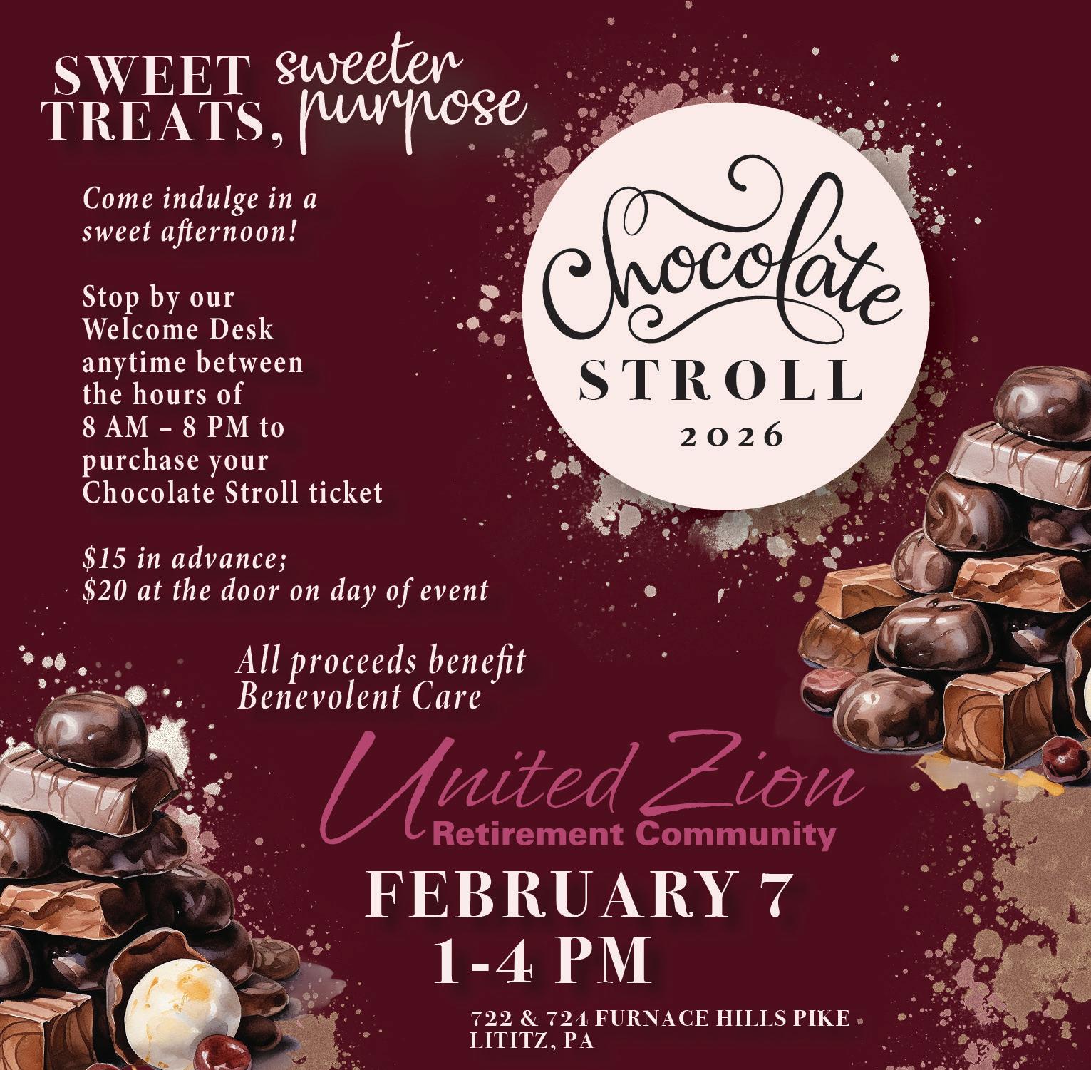 United Zion Retirement Community, 722 Furnace Hills Pike, Lititz, will host its Chocolate Stroll on Saturday, Feb. 7, from 1 to 4 p.m.