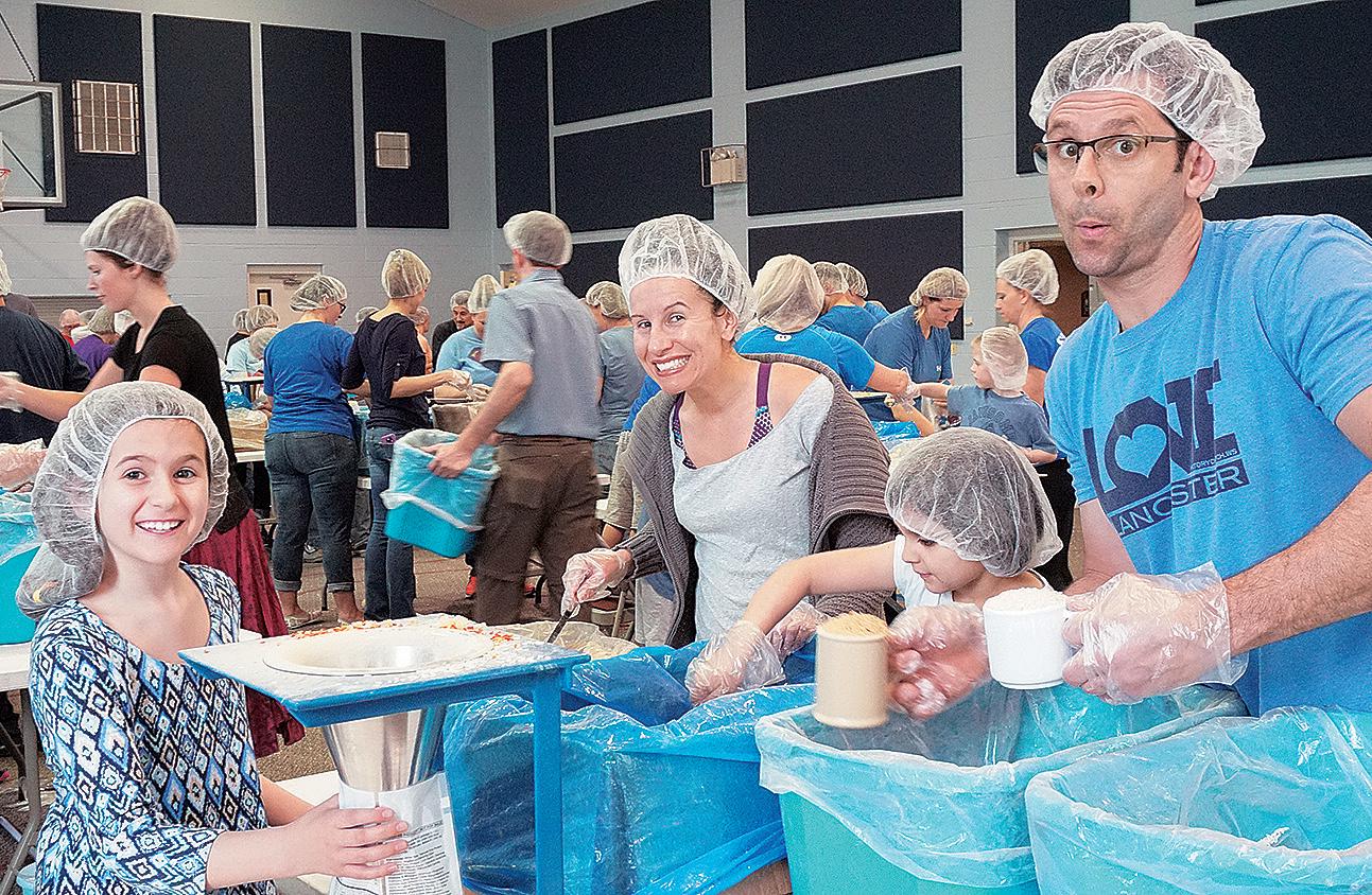 This year, the plan is to have 2,000 volunteers work two-hour shifts to pack 400,000 meals in three days. There are no age limitations. For safety and efficiency, studentto-adult ratios are put in