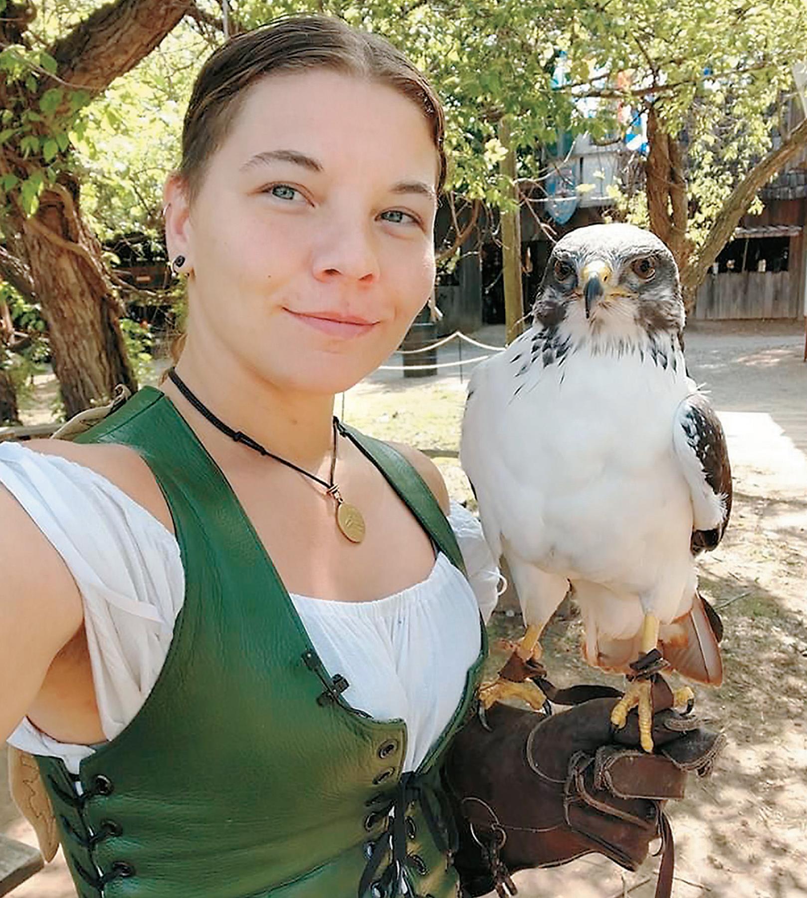 Cryss Stacey has developed a connection with the birds of prey she handles, including Kasai, an African augur buzzard.