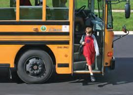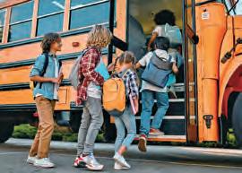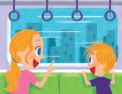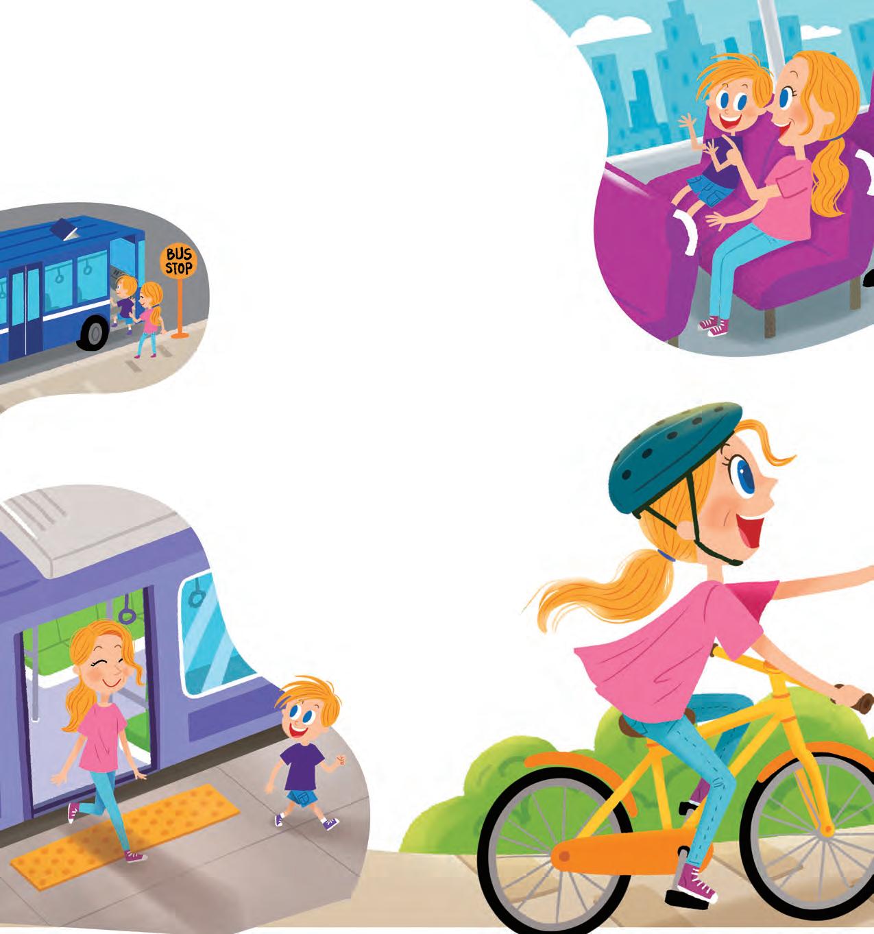 They get on a bus and find seats. The bus bounces up and down. They get off the bus.
