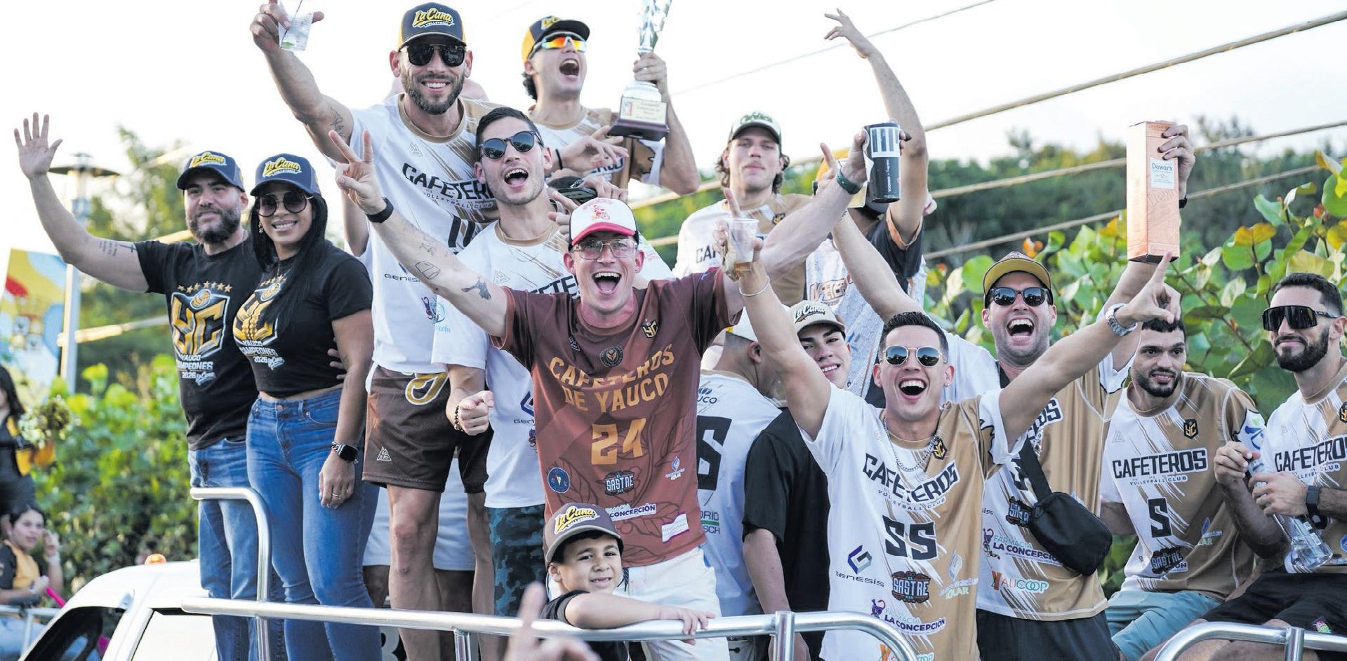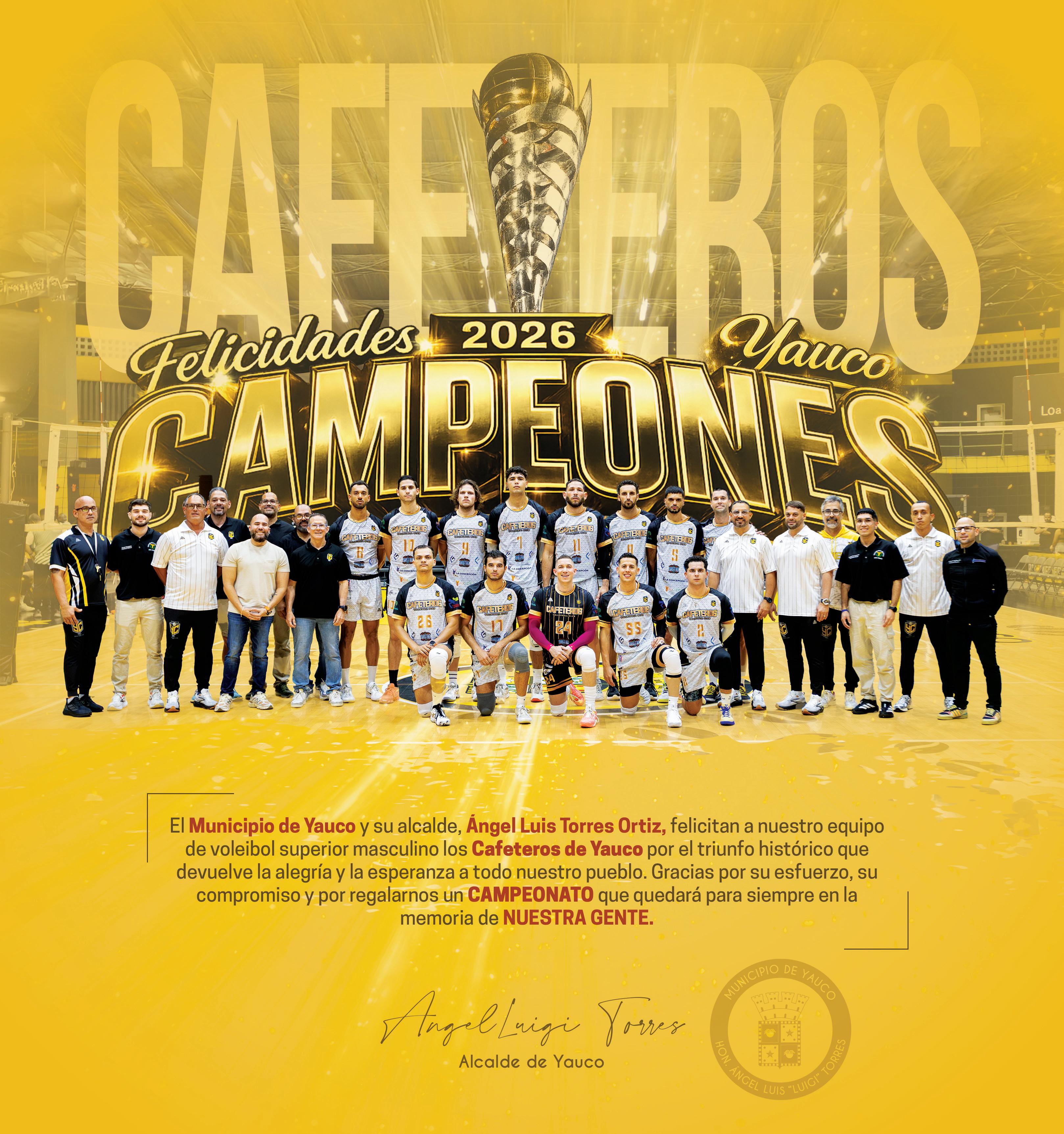 del sexteto yaucano, confeccionaron carteles y apoyaron a su equipo con esperanza e intensidad. El amor fue recíproco: jugadores y miembros del staff visitaron escuelas y diferentes lugares, compartiendo con la comunidad. ““Nuestro pueblo volvió a soñar y escribió una de las páginas más hermosas de su historia deportiva. Después de 55 años de espera, 29 sin llegar a una final y 6 años desde que decidimos volver a creer en este proyecto, hoy celebramos con el corazón lleno un logro que demuestra que la fe, el trabajo y la unión de nuestra gente siempre valen la pena. Quiero felicitar con enorme orgullo a nuestros jugadores y a todo el cuerpo técnico por dejarnos el alma en cada juego y regalarnos esta alegría que quedará para siempre en la memoria de nuestro pueblo”, expresó el alcalde Ángel “Luigi” Torres. La celebración oficial se realizó el domingo 25 de enero de 2026, con una gran caravana que partió desde las letras emblemáticas de Yauco, en barrio Jacanas, hasta la Plaza Fernando de Pacheco y Matos. Cientos de personas acompañaron a los campeones en un ambiente familiar y festivo. El alcalde Torres y la primera dama, Arline Roig Sepúlveda, recibieron al equipo, mientras la fanaticada tuvo la oportunidad de retratarse con sus jugadores favoritos. “Los Cafeteros han puesto el nombre de nuestro