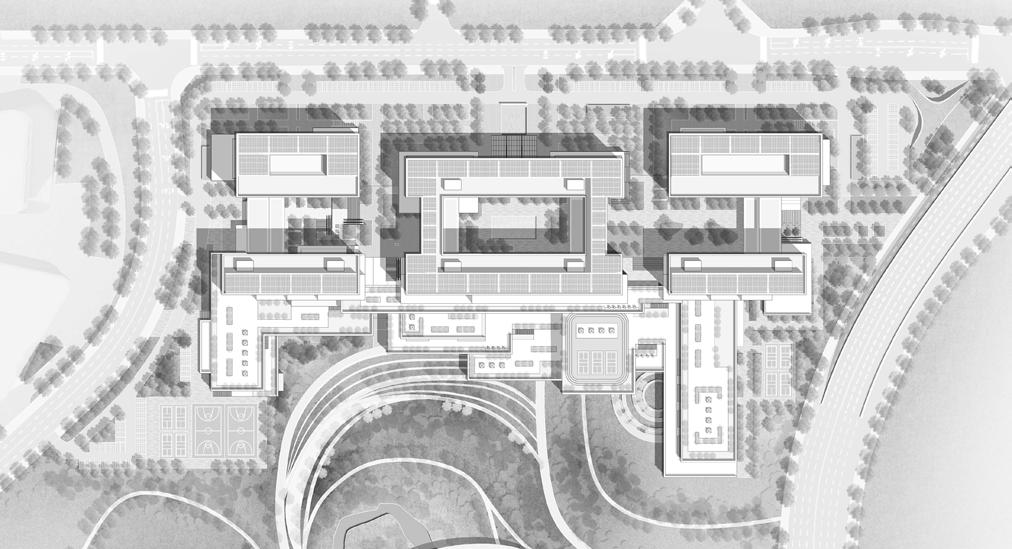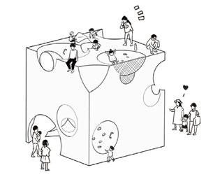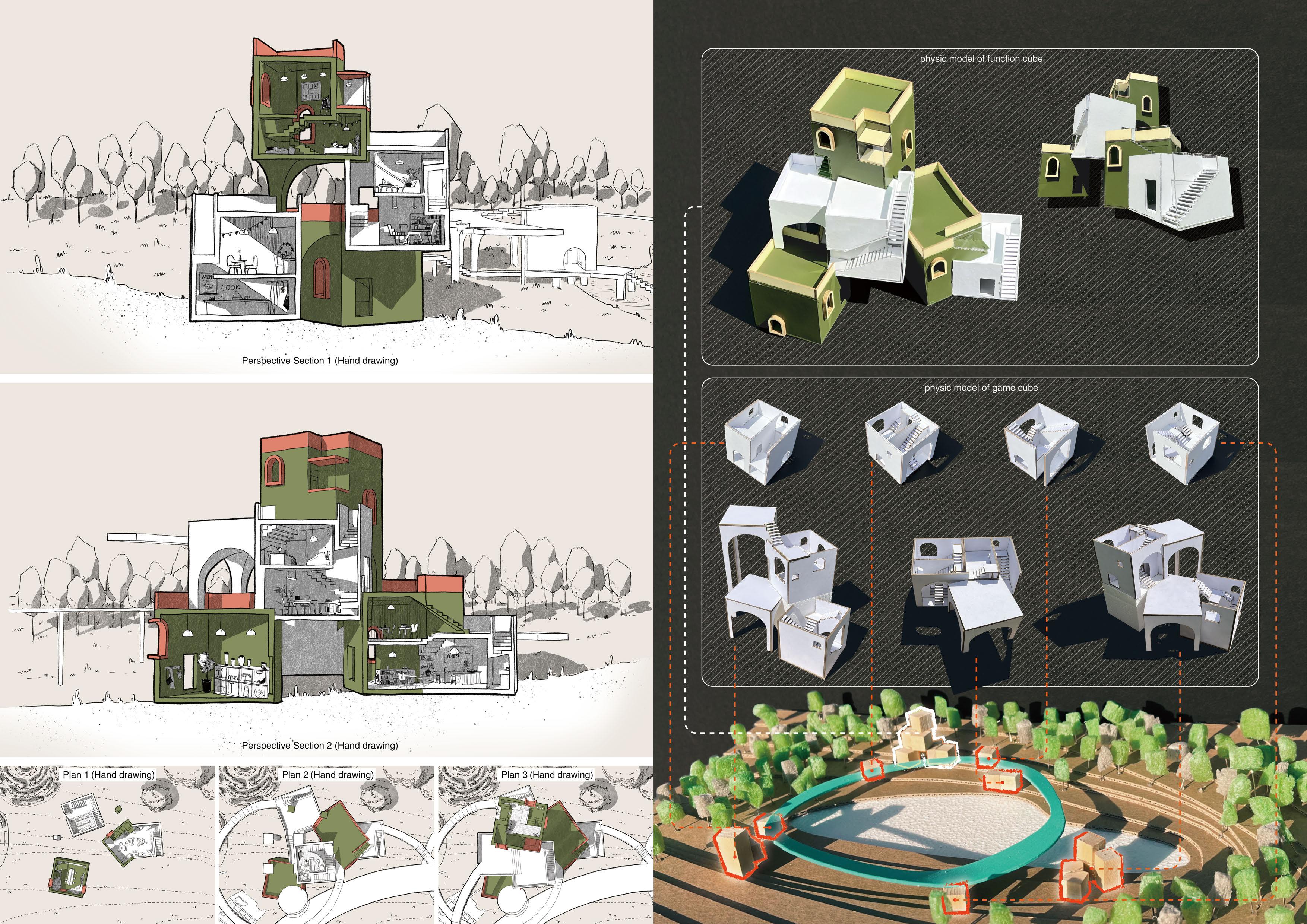 The design incorporates “game cubes,” modular structures that act as dynamic play spaces while preserving the site’s original environmental features. Organized along a continuous loop, the cubes are linked by circular stairs and varying ground textures, promoting interaction with the landscape. A threestory community hub complements these outdoor spaces, offering indoor activity areas, resting zones, and operational spaces for staff.
