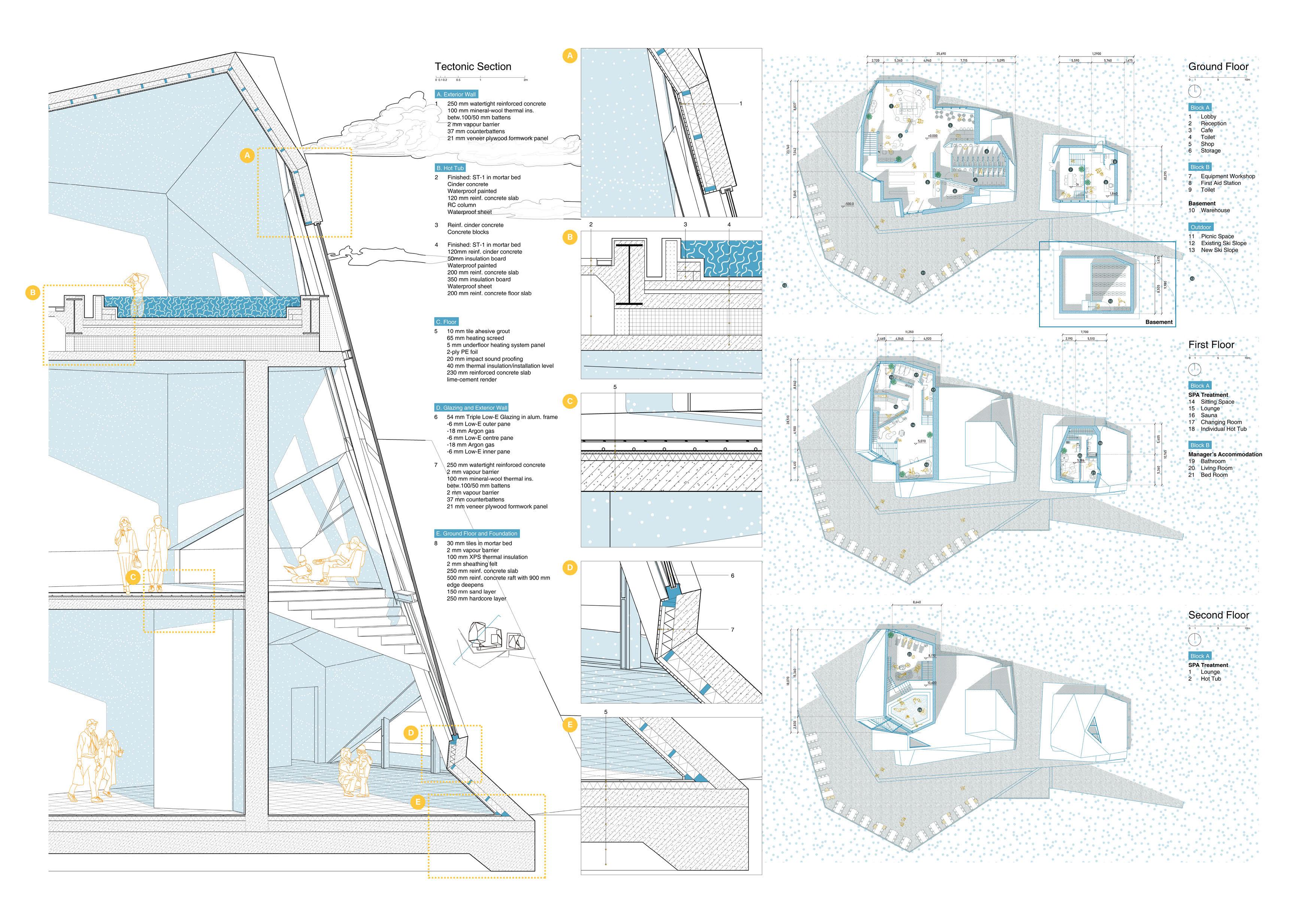 Block A houses essential visitor amenities, with a reception, café, retail shop, and restrooms on the ground floor. The upper levels offer tranquil spa facilities, including private hot tubs, saunas, and a communal lounge with panoramic mountain views. The seamless flow between active and restful spaces ensures a balanced experience for all visitors.