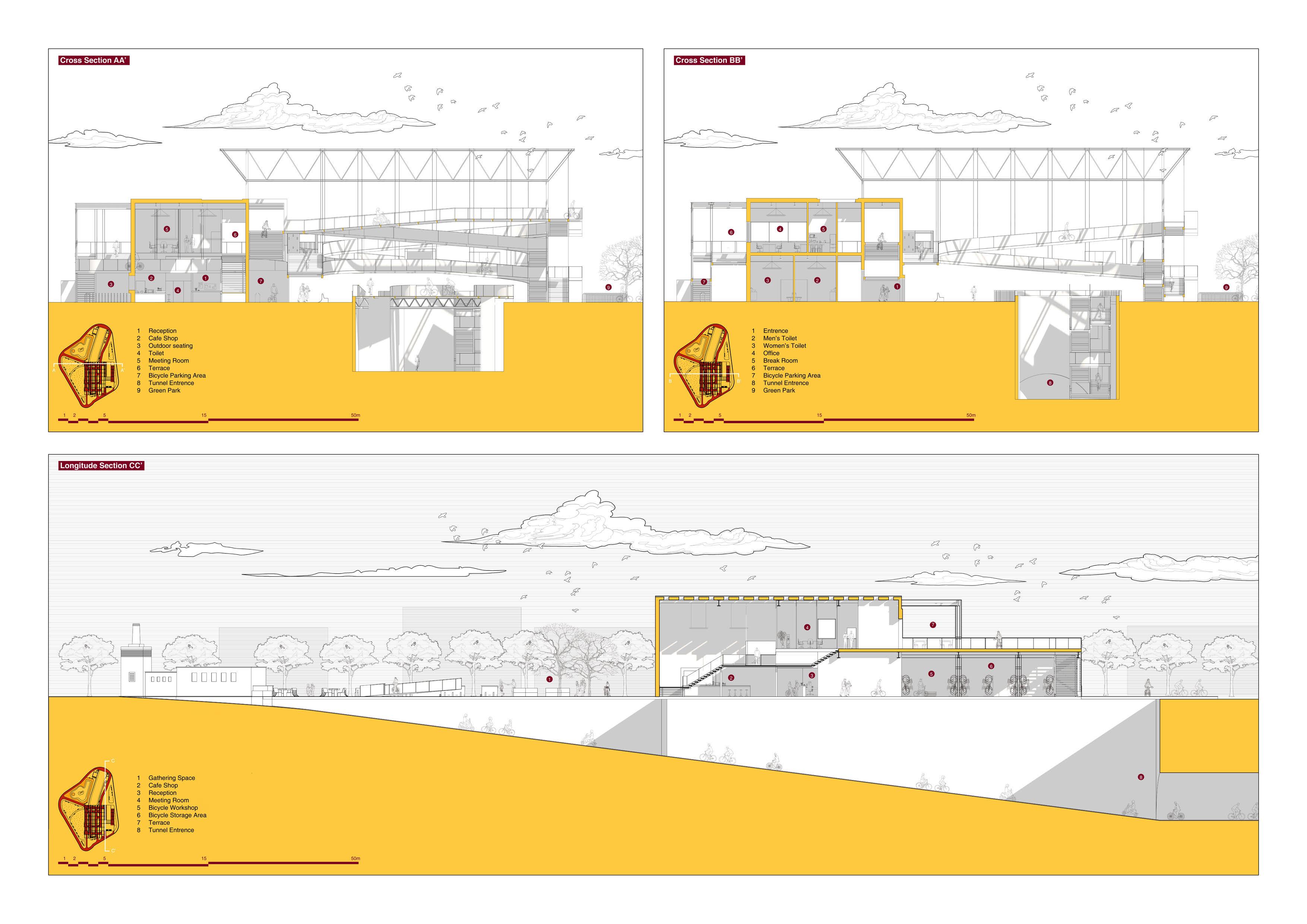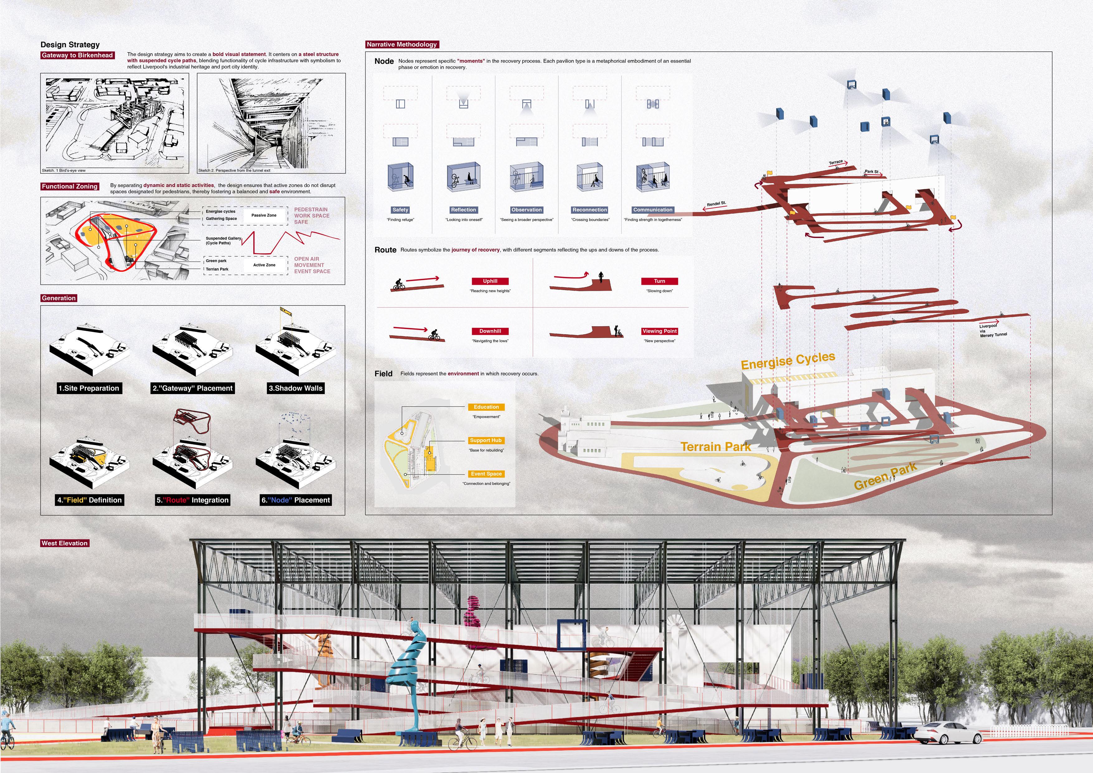 By focusing on narrative design, the project creates a non-linear experience through nodes, routes, and fields, each representing stages of recovery and growth. Resting pavilions offer spaces for reflection, observation, and support, while the cycle path symbolizes the challenges and triumphs of individual journeys. This transformative design establishes a landmark of care and empowerment, fostering connection and inclusivity in Birkenhead.