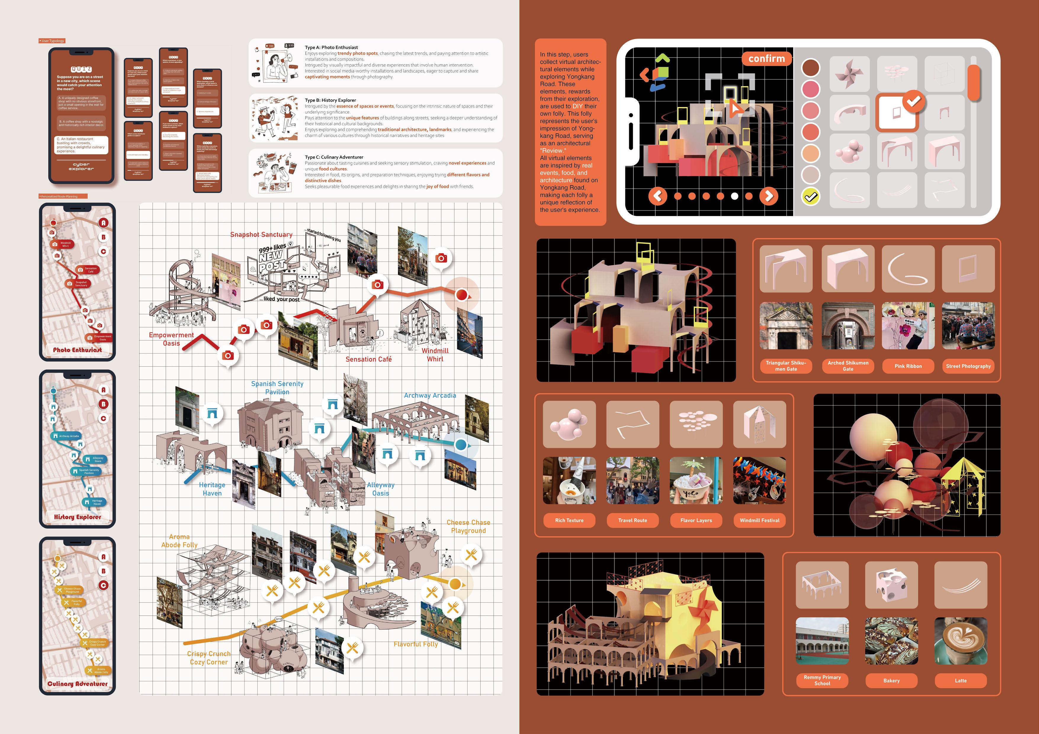 The project begins by conducting a survey to understand user preferences. Based on these preferences, the app recommends various exploration points along Yongkang Road. As users explore these points, they collect virtual architectural elements related to the street. Upon completing their exploration, users can use these collected elements to create their own virtual folly. This folly represents their unique commentary on the architectural styles of Yongkang Road.