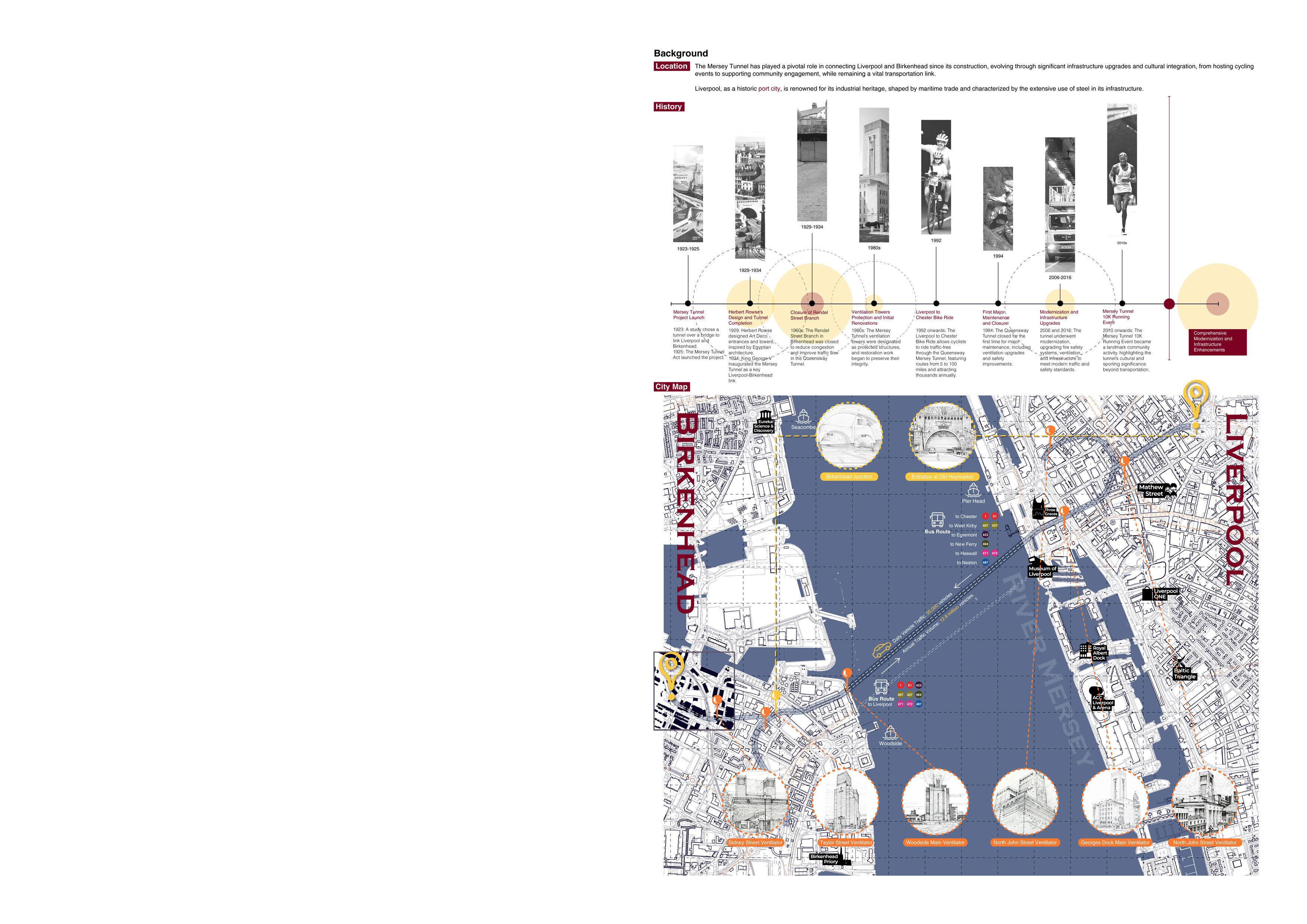 This project proposes activating the permanently closed entrance to Liverpool's Mersey Tunnel by introducing a cycling company and art gallery. Envisioned as a vibrant gateway, the design redefines the site as a future access point for a proposed cycling route within the tunnel. By integrating a suspended cycle path with a narrative strategy, the project reimagines the infrastructure as both functional and experiential.