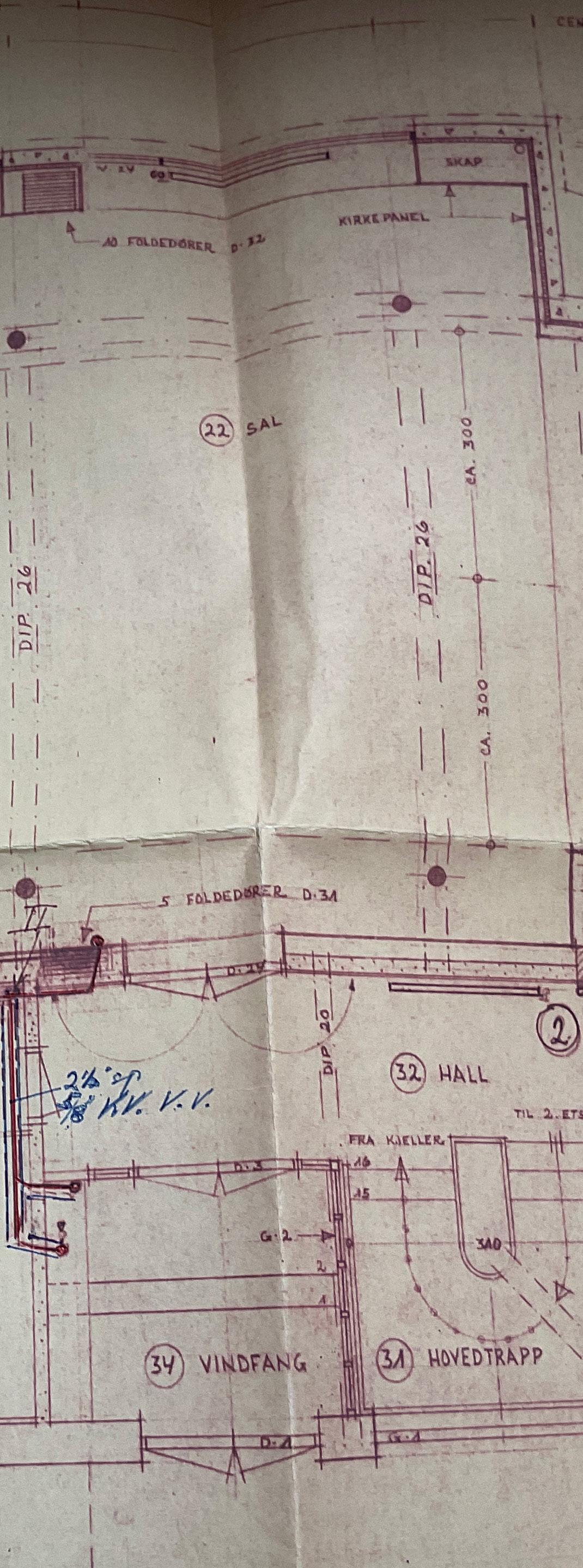 Grundriss und Skizze zum Gemeindesaal: Mit dem Kauf des Hauses wurden 1960 von Architekt Thilo Schoner verschiedene Pläne zur Innengestaltung angefertigt. Am 6.10.2024 können diese im Original in einer Ausstellung in unserem Haus der Gemeinde bestaunt werden.