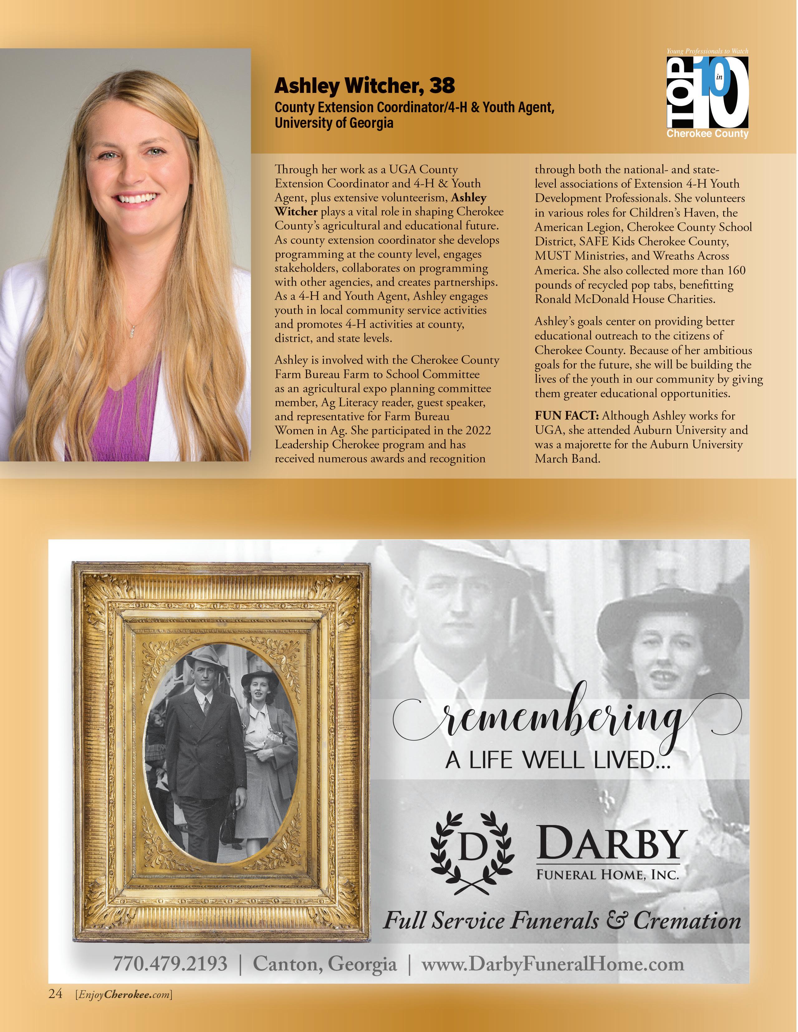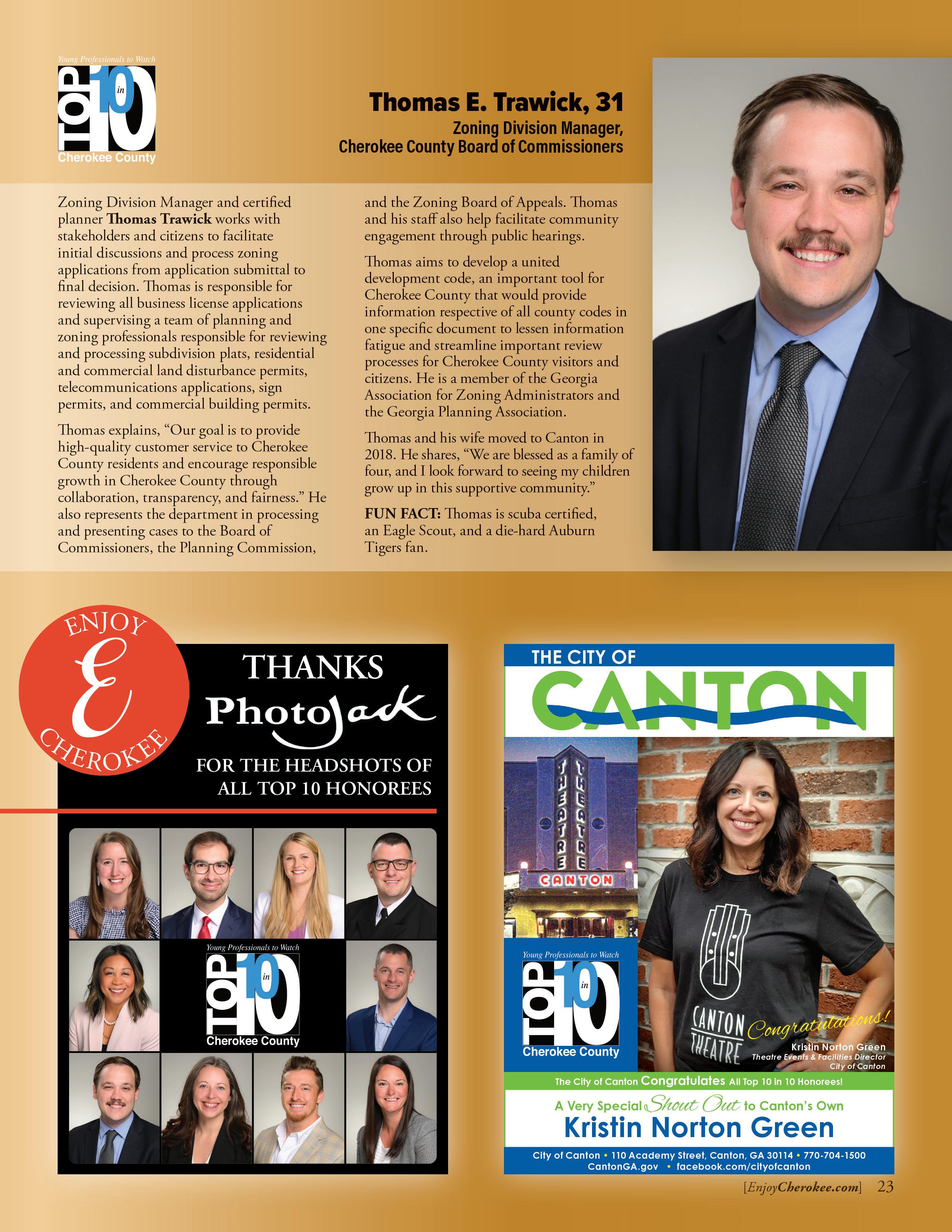 Top 10 in 10 Cherokee County Chamber of Commerce and Enjoy Cherokee Magazine present the 2023 honorees of Cherokee County’s Top 10 in 10 Young Professionals to Watch.
