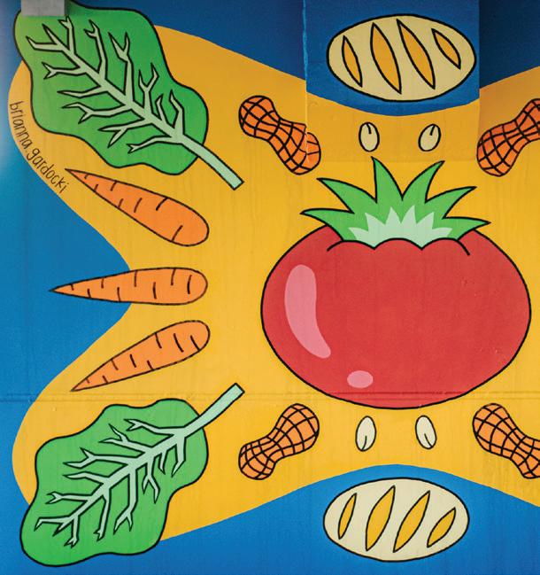 Her mural celebrates Georgia’s agricultural abundance and features collard greens, peanuts, sourdough bread, honey, watermelons, berries, and a large, ripe peach. The artist chose each element carefully to showcase the flavors and traditions that make the market a beloved part of the Woodstock community.