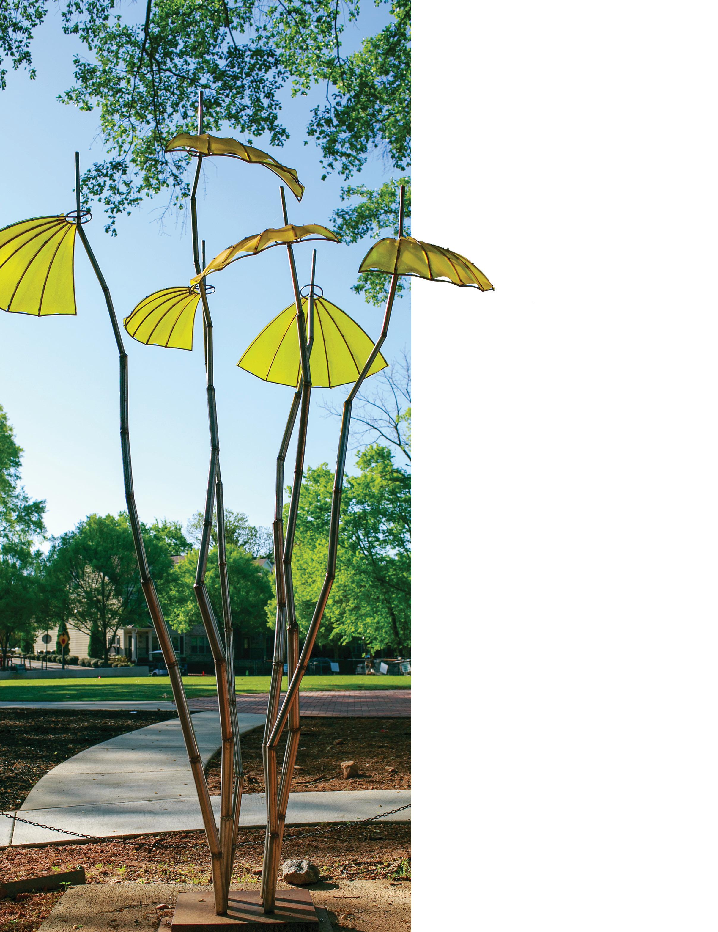 Public art is indispensable. It can serve as the foundation of a community, express a community’s livelihood and history, and even deliver a message. Symbiosis, located near the stage at Woodstock Arts Event Green, is a prime example. The stainless-steel sculpture features vibrant yellow “umbrella-like” leaves that cast perfect yellow shadows at certain times of the day. Richard Herzog’s artwork builds a bridge to connect the normal and abnormal while emphasizing mankind’s disconnection from nature.