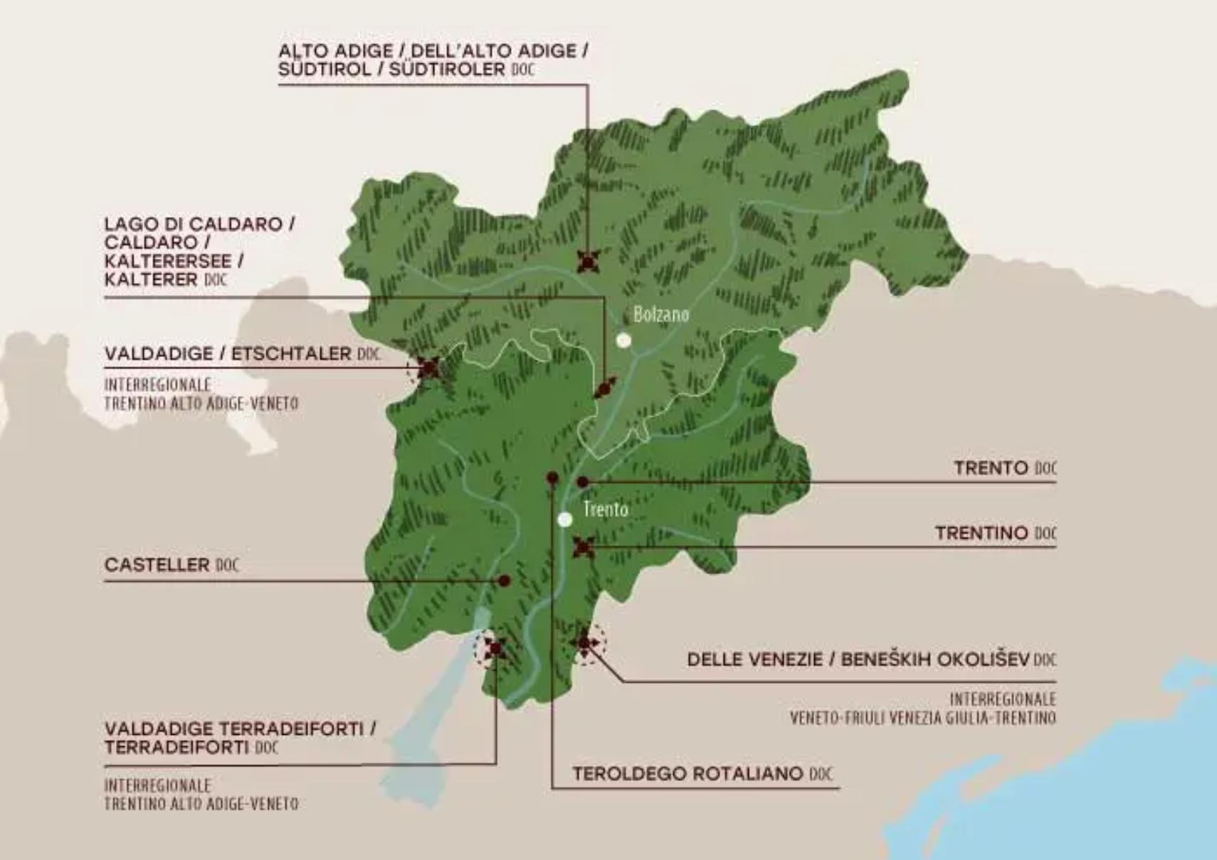 Allwinesarelabeledundertheirregionalname TrentinoDOC and AltoAdigeDOC,withthe indicationofthegrapevariety.FortheSparklingwinesthelabelis TrentoDOC.