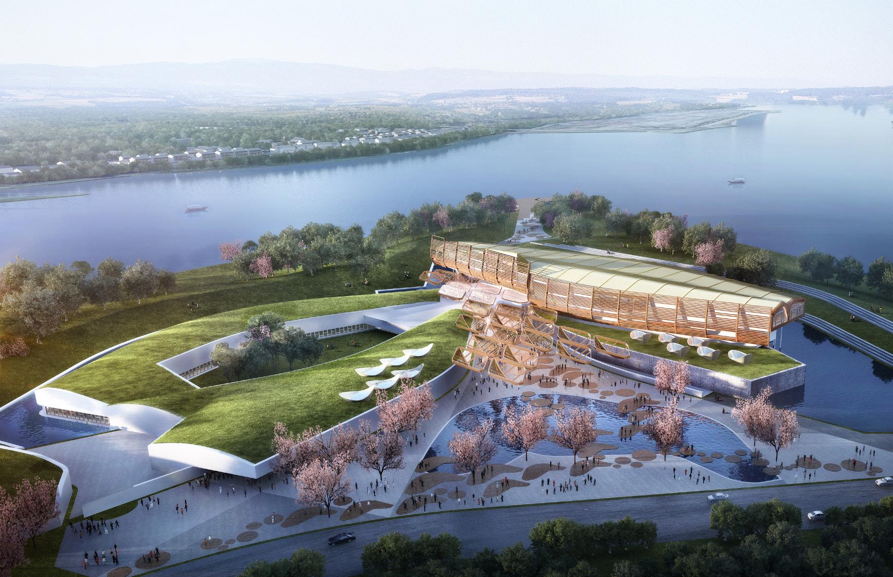 The competition asked to design a Museum for ancient chineese boats discovered in the Sichuan province. Our focus was to create an archeological park to discover the treasure by transforming the landscape so the visitors will experience not only the view of the treasure but the process to recover and the history around it. There are two main buildings with there roof inspirated by the geometry of the boat; this buildings are connected by the main lobby .The building with with the green roof